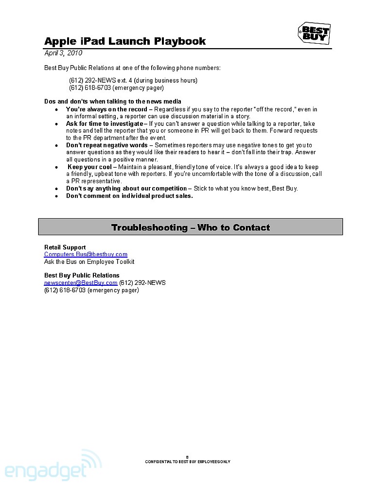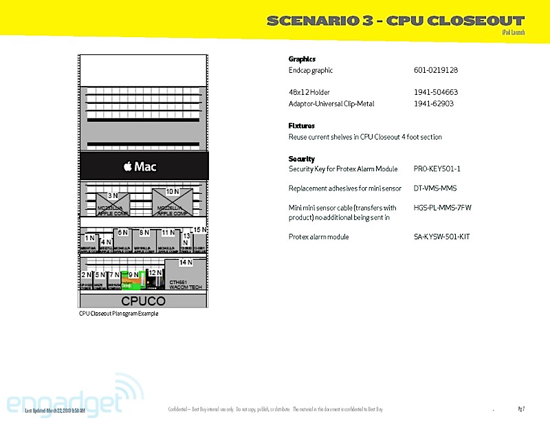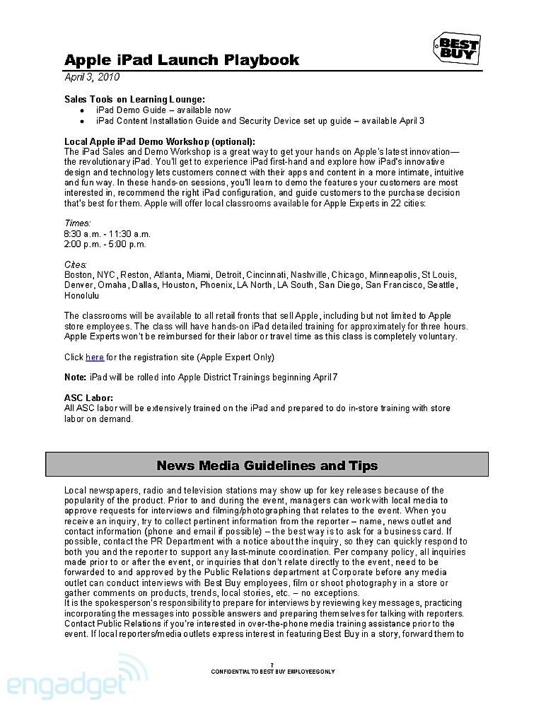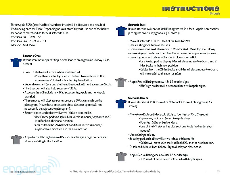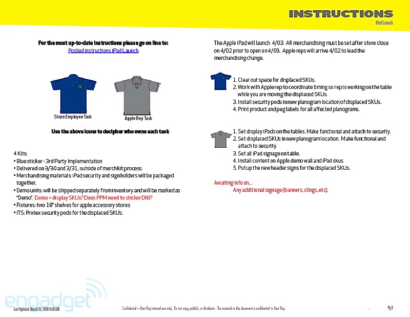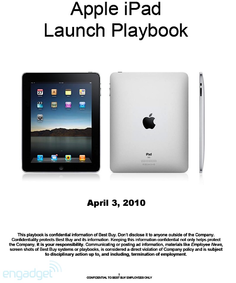They're doing the normal routine, especially for a launch that Apple usually dictates. The playbook details how managers, as well as employees, should handle themselves throughout the day. It even breaks down how the set-up should go about the night before, when Best Buys will erect iPad-specific parts of the stores. As the playbook dictates, that should take about 8 hours, so Best Buy employees are going to need to drink a lot of coffee. Of course, we'll enjoy their hard work by staring at it while we wait in line.