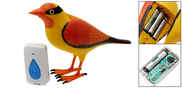 Powered by four AAA batteries in all – one for the button, three for the bird – each has a 2W speaker to make sure you can't avoid the crazed squawking. As the sales description so memorably puts it, "Delicate smart part, makes the doorbell a saluting angel of dwelling house, work building, hotel, tire building, factory and so on, you will never miss any guest."
