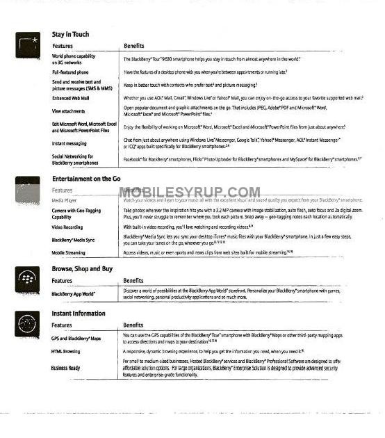 It looks, judging by these images, like someone has been faxing something they shouldn't have, but when the leak is a detailed spec-sheet for the BlackBerry Tour 9630 we won't quibble over it coming on thermal paper. According to MobileSyrup's source, the Tour 9630 will arrive on Canadian carrier Bell in mid-July, bringing with it an HVGA 480 x 360 display, 3.2-megapixel autofocus camera with flash, quadband GSM/GPRS/EDGE, 2100MHz UMTS/HSPA and 800/1900MHz EVDO Rev.A.