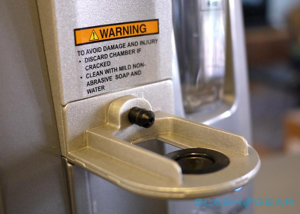 The system is simple. Like French press or drip you put relatively course-grind coffee into a brew container, to which hot water is added. Bunn then injects air, agitating to extract the flavors and oils, and then uses air to force out the coffee leaving behind a dry puck of spent grounds. Different levels of air agitation can be selected, and different steeping times, including longer periods which Bunn intends to be used with tea instead.