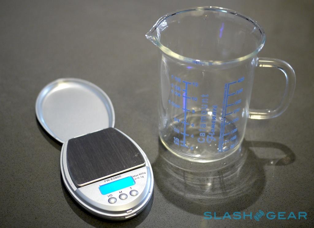 To the left is the brewing chamber itself. Bunn provides two – along with the glass beaker, a small digital scale to weigh out your coffee, and a scoop – made from thick BPA-free plastic with a fixed stainless steel mesh filter at the bottom and a chunky handle. It slides into place in the bracket on a couple of grooves, and then locks into place with the reassuringly-tactile latch on top. Underneath, in a semi-circular cutout, is a removable drip tray; it's easy to empty, which is useful since you'll be doing that fairly frequently as its capacity is small.