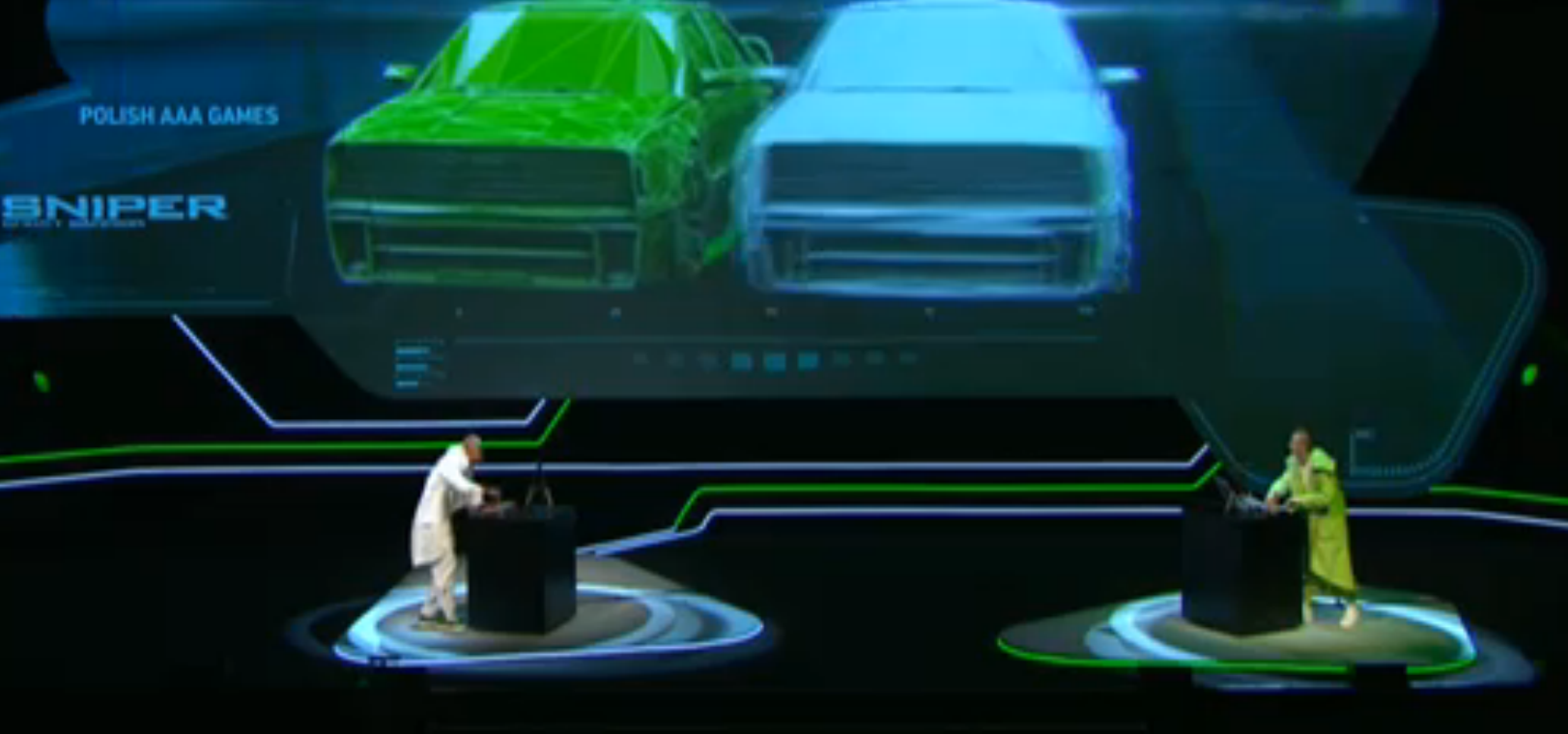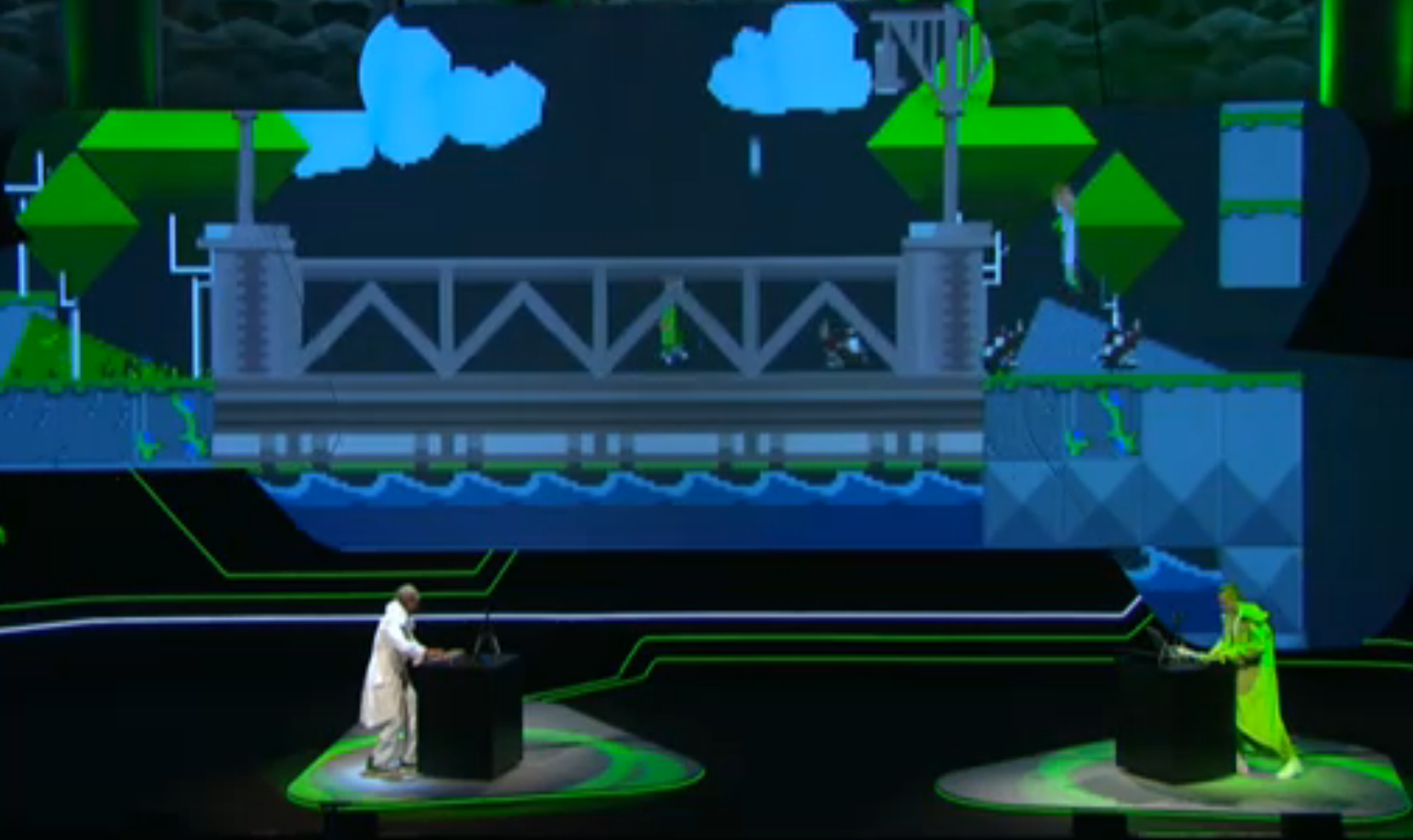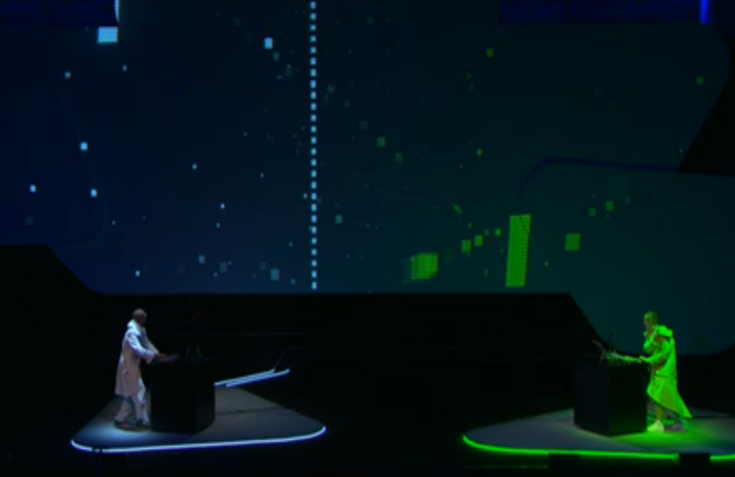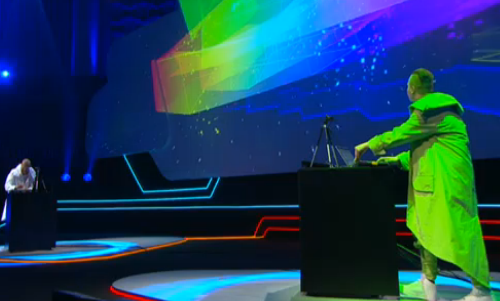 A musical interlude was shown featuring two musicians creating images on the big screen with their musical machines. This absolutely awesome interactive display showed games like PONG, flashed multi-colored digital rainbow streams, and displayed statistics about the Polish-influenced electronics industry. A lovely barrage of tunes were heard while it all went wild.