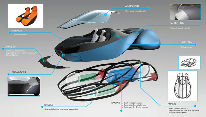 The Chase 2053 is an attractive concept, no doubt. Røed envisions a vehicle that can't be damaged, thanks to its construction from carbon nanotubes. If the construction isn't any indicator, Røed envisions this from a purely science-fiction point of view. The vehicle also has sections of it created from fabric skin, which is a stretchable organic material. There's a hydrogen-powered jet engine under the hood. The Chase 2053 is also capable of flying, or hovering to be more exact.