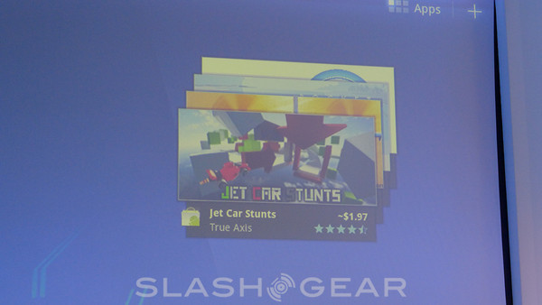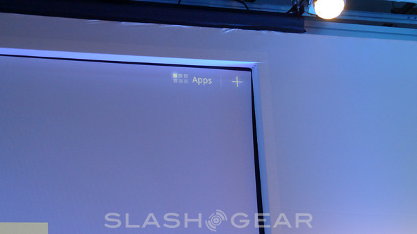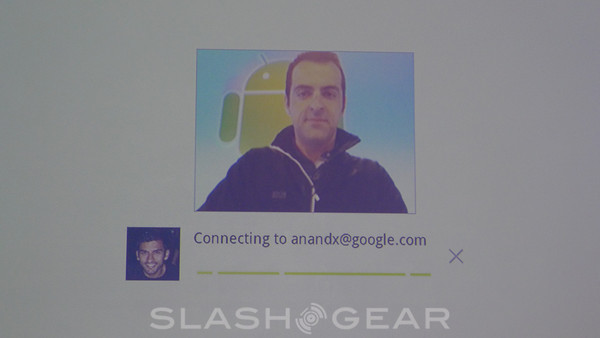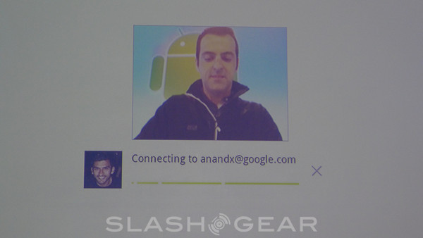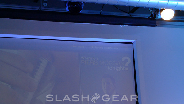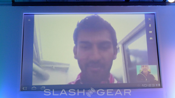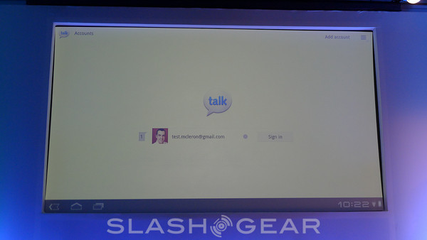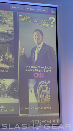 With a single click, they thusly were connected through video chat. After a short bout with attempting to find a user by the name of "Lady Killer," later revealed to be Cee-Lo Green, the user on stage and his friendly other-screen ally were able to connect visually. It's revealed that, in the classic manner, the user's image is tiny in the lower right of the screen while the person they're talking to takes up the entire remainder. This functionality appears to work instantly and smoothly. The video quality isn't perfect, but the video works so well and functions so fast, we're willing to forgive, for now. After the video chat demo, a CNN rep steps on stage to show his and their wares. The Vice President of Mobile for CNN speaks up and out of a CNN app that will be launching for the Honeycomb tablet in the near future. This is a giant gallery-aesthetic app that appears to work very smooth, flicking back and forth between stories, showing live coverage of news via the tablet.