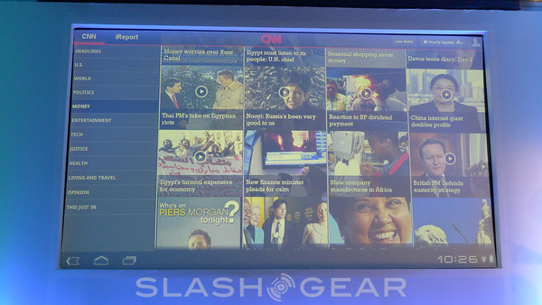 Head stories as well as breaking news are shown instantly via Honeycomb in this CNN app. A CNN rep by the name of Lila shows iReport – a portion of the CNN app that allows people to share videos and photos from wherever they happen to be in the world. This piece of CNN's master Android plan will also soon be available as an app on the Honeycomb-based tablet. How they'll avoid all sorts of inappropriate images and videos, we don't know. This is where CNN gets all of their "on the spot" coverage, like the skit on SNL. They hope that with the combination of all of the different elements they'll be collecting and spreading with these apps, a new form of news will grow.