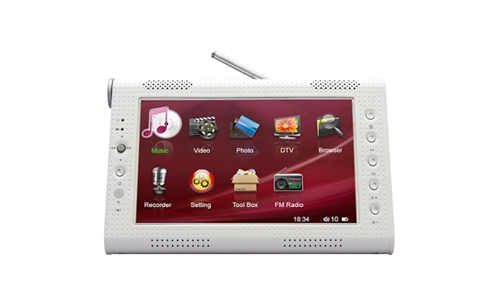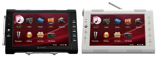Compal have quietly unveiled two new internet-connected touchscreen PMPs, the APA00 (black) and APA01 (white). Each has DVB-T digital TV, the ability to record to a 1.8-inch internal hard-drive, native HD support up to 1080i, and WiFi b/g. Control is via the 7-inch, 800 x 480 touchscreen, with both PMPs running the uCLinux operating system with a custom finger-friendly GUI.
