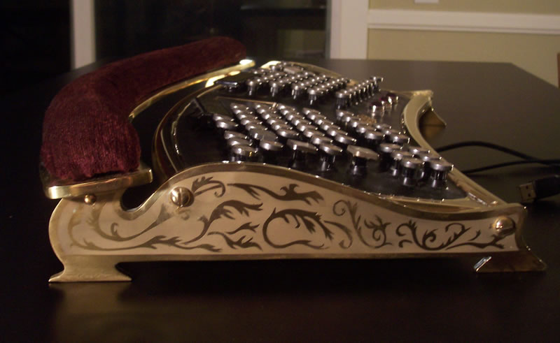 Take one rare IBM Model M-15 split ergonomic keyboard, add a flourish of Steampunk mods, and you end up with this, the Datamancer Ergo. A custom commission, the Ergo combines the M-15's inverted slant, a velvet wrist-rest and an integrated buttonless trackpad, together with violet LEDs and an etched acanthus-leaf pattern.