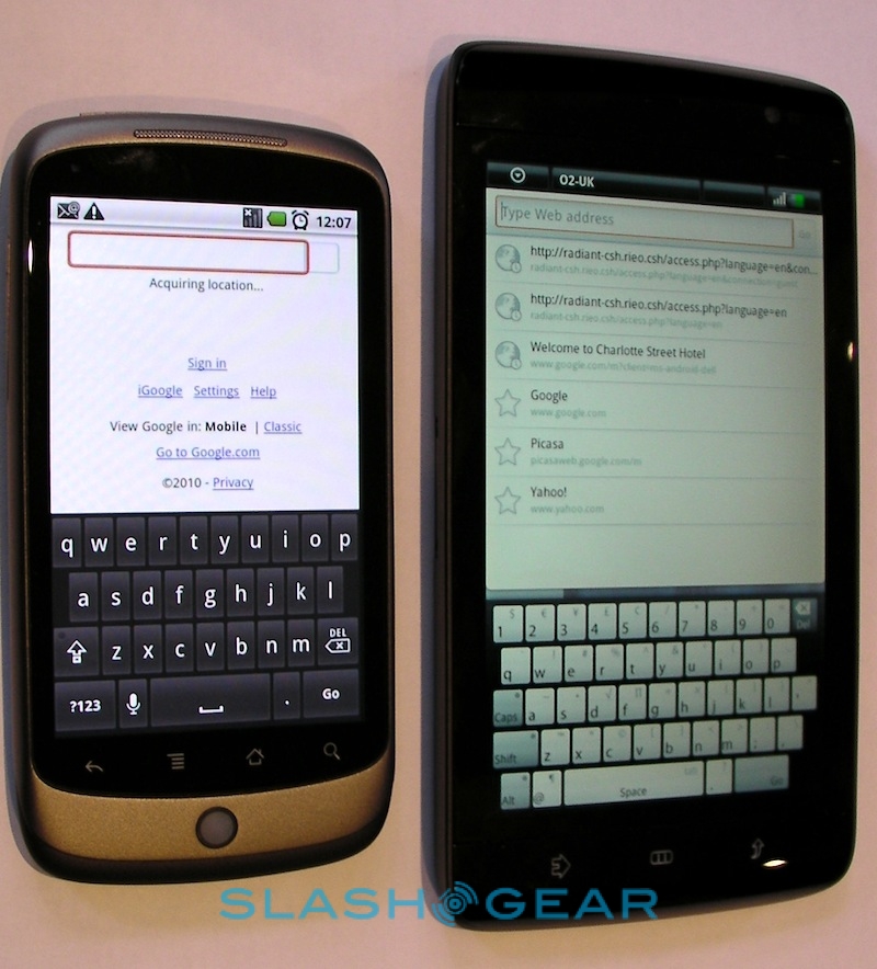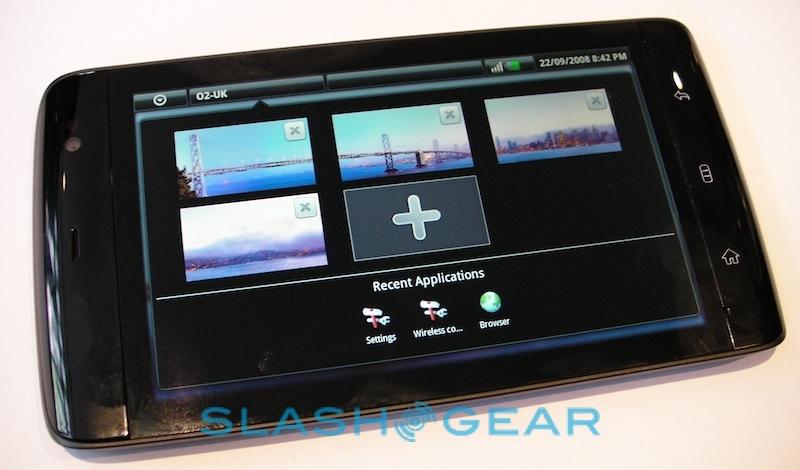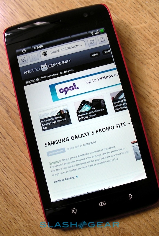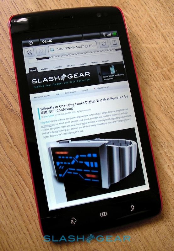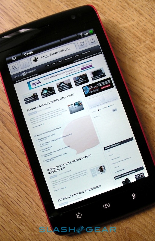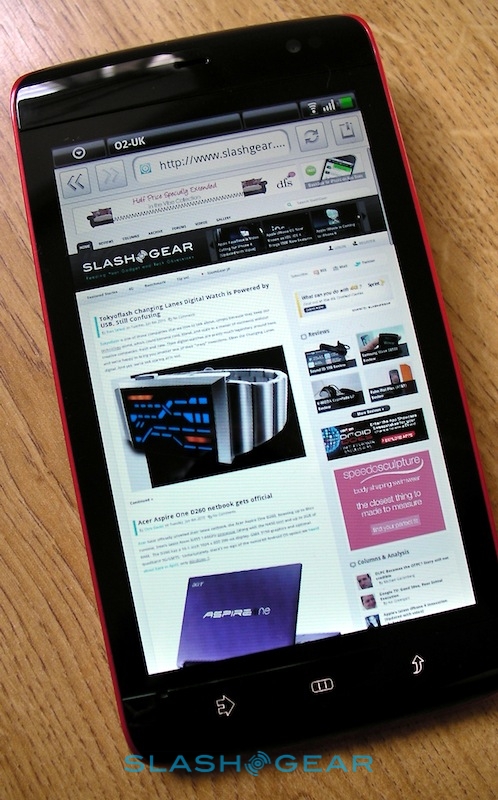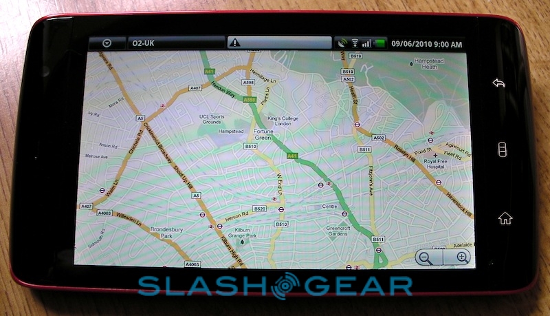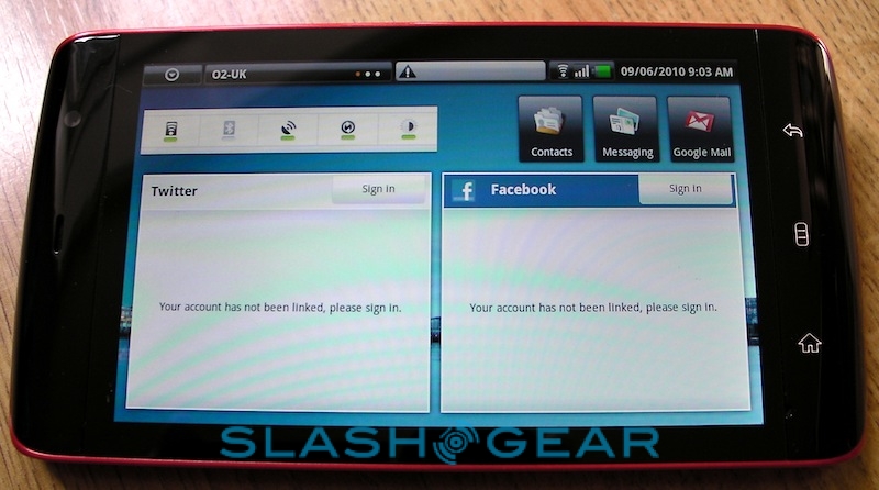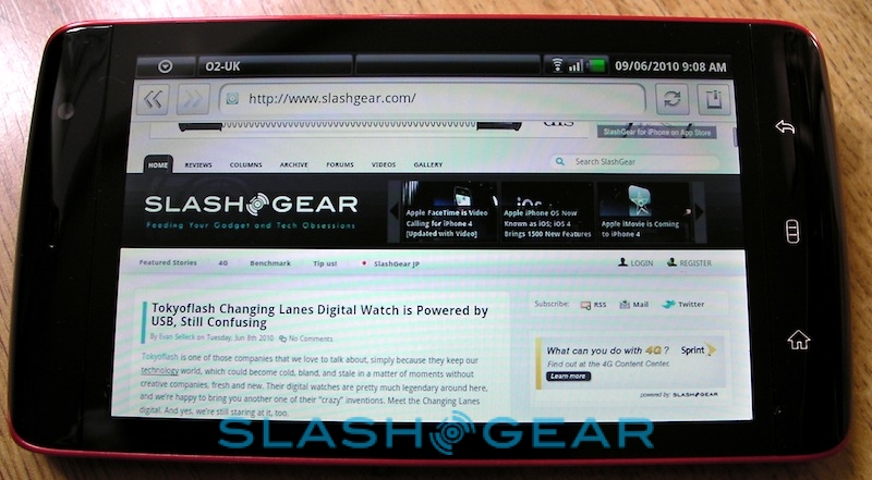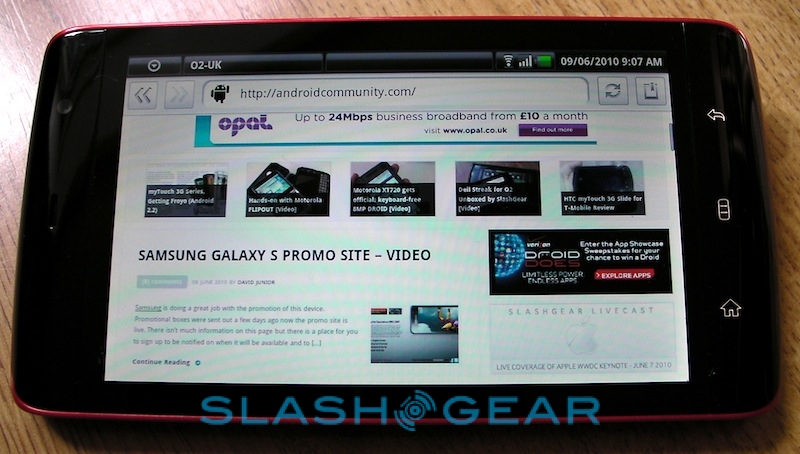 That, then, is the Streak's real strength: its brilliant web browsing experience coupled to some slick multitasking support. We quickly had the Spotify for Android app downloaded and streaming – audio quality is great, and even the standard wired headset is surprisingly good quality; of course you can also use your own or pair up some stereo Bluetooth headphones – while surfing through the Webkit-based browser. That supports multitouch for pinch-zooming, though bizarrely it doesn't respond to double-taps to automatically zoom in on blocks of text or images. Still, thanks to the broad display there's no problem reading text-heavy sites; we were able to zoom out to show the full width of the SlashGear homepage and still read individual articles. There's no Flash 10.1 support; Adobe have announced that the official release client for Android will arrive later this month, though the Streak will need its Android update before it can make use of it.