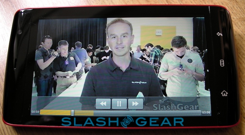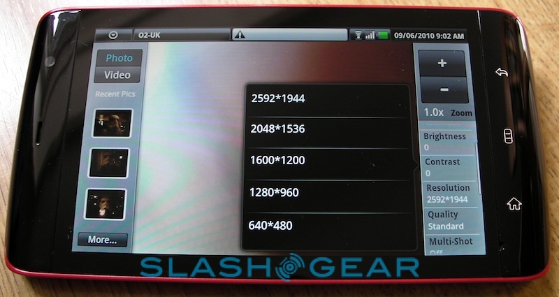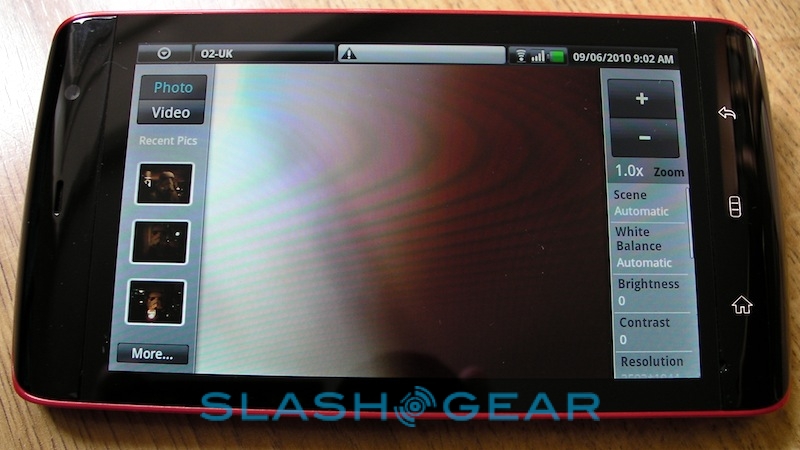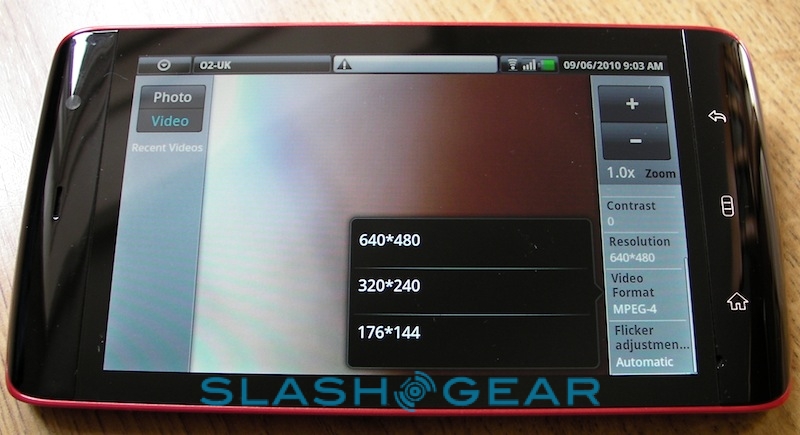 Videos – like photos – are navigated through a non-standard Android UI, in this case courtesy of ArcSoft's Mobile Media Gallery app. That can mix both types of content in the same view, separate them out, and sort them along the timeline that they were shot or loaded. As for the Streak's own camera, the 5-megapixel autofocus shooter has reasonable color balance though tends toward over-saturating images, and the shutter shows a little lag. The dual-LED flash is, like most of its ilk, mediocre, with a narrow sweet-spot in terms of range that, outside of which, photos are invariably hopelessly dark or washed out. Unlike many of the more recent handsets we're seeing, the Streak lacks 720p HD video recording, and instead maxes out at 640 x 480 VGA resolution. Clips are, again, reasonable in their quality, but they won't replace a dedicated Flip-style budget camcorder.