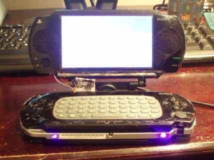 Meanwhile the rest of the PSP – now with the QWERTY keyboard – remains on the bottom, only with some new LED lighting. A custom flat cable extension connects the LCD ZIF port to the screen itself. No word on how long it took him, nor how much he spent, but this is certainly a unique PSP.