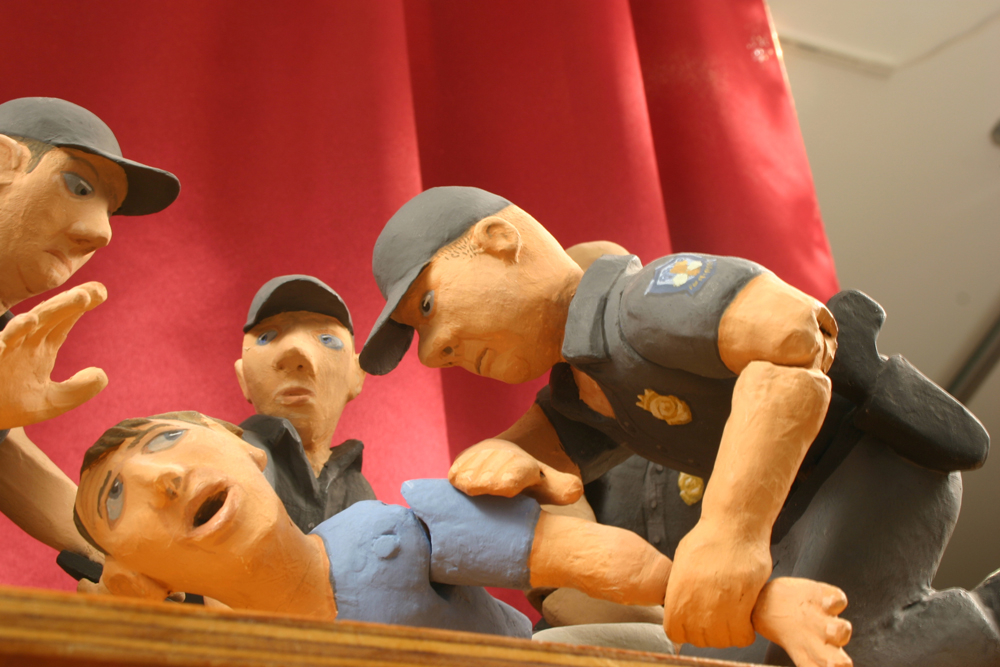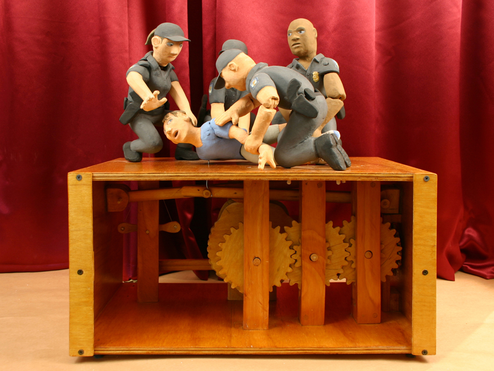 Haddock's piece is created from wood and paper mache, and shows Andrew Meyer and four of the arresting officers struggling on the floor. The great thing about this being a hand-cranked diorama is that you can make them struggle as much or as little as you like; unfortunately you'll have to use your imagination to picture Senator John Kerry.