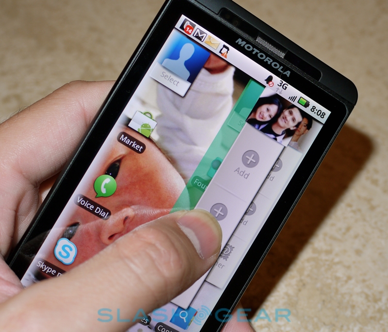 On the DROID X, meanwhile, Motorola aren't calling the social networking integration MOTOBLUR. Instead, it's a somewhat nebulous UI enhancement, bypassing Motorola's server-based login system – which requires a user account be created and whichever social networks you're using be registered to it – and instead pings the networks itself. A couple of simple update widgets bring new messages to the homescreen; you can register accounts from Facebook, MySpace, Photobucket, Picasa, Skype and Twitter. Once done, the DROID X pulls in your contacts on each service and attempts to amalgamate them with your existing contacts, something we had mixed success with.