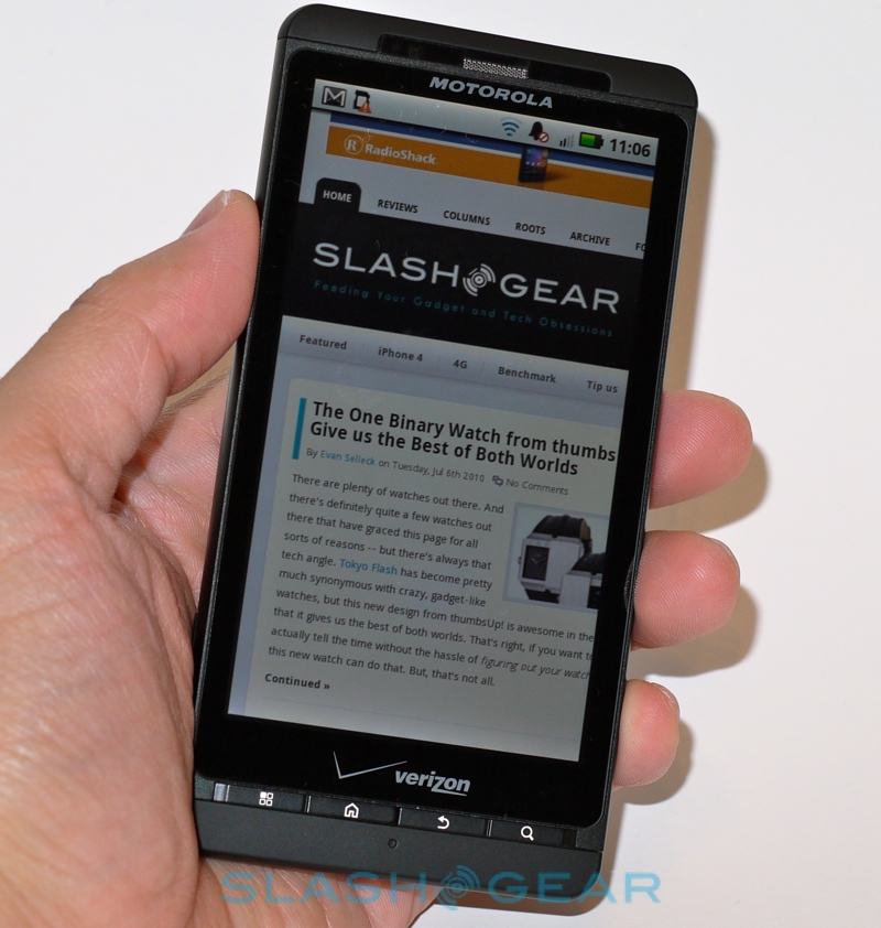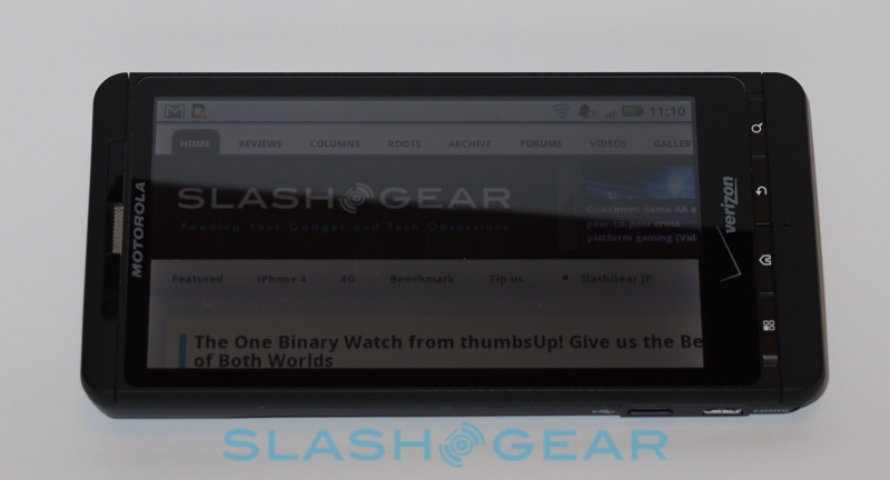 As it is, you get Android 2.1 and the usual array of Google apps like Gmail, YouTube and Google Maps Navigation. The DROID X's strong CPU performance shows its hand in the browser, with snappy rendering and lag-free panning, pinch-zooming and scrolling. No Flash support, of course, until Android 2.2 brings its Flash 10.1 to the phone. There's also access to the Android Market, with its growing selection of apps, and true multitasking of the sort that iPhone 4 owners can only dream about.
