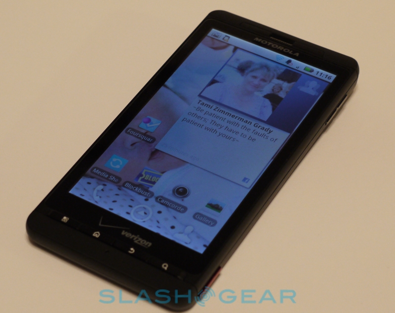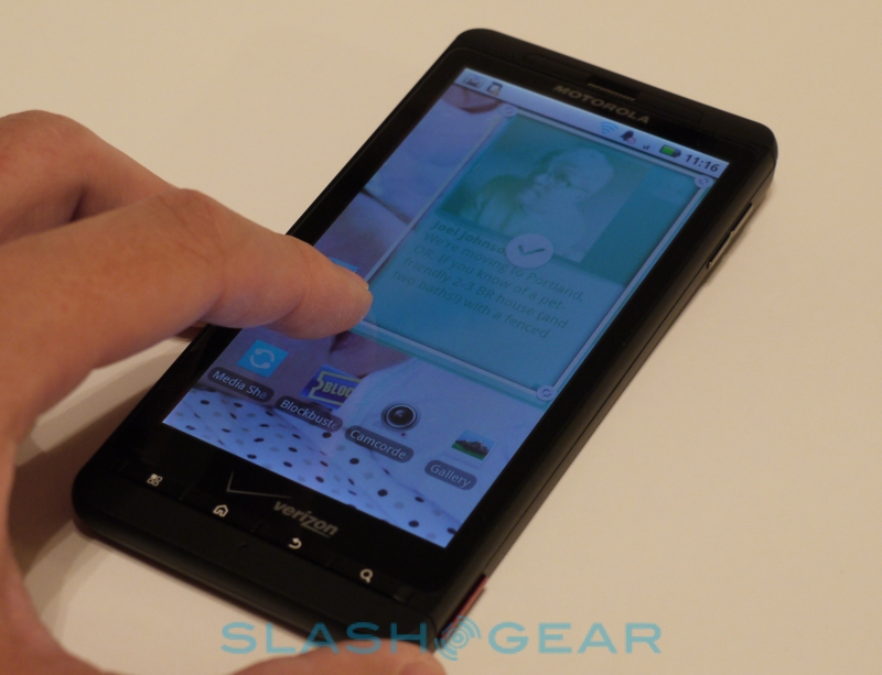 Motorola's other significant change to the stock Android experience is their latest interpretation of MOTOBLUR. Introduced to great fanfare on some of the company's mainstream models – not, for instance, the DROID – MOTOBLUR promised to suck all your social networks into a single place, filling the desktop with various widgets. While it found some favor, it also proved a turn-off to many more serious users; the MOTOBLUR desktop looked cluttered, overwhelming, and – ironically – lacked some of the more obvious tools like pulling out @-replies in Twitter.