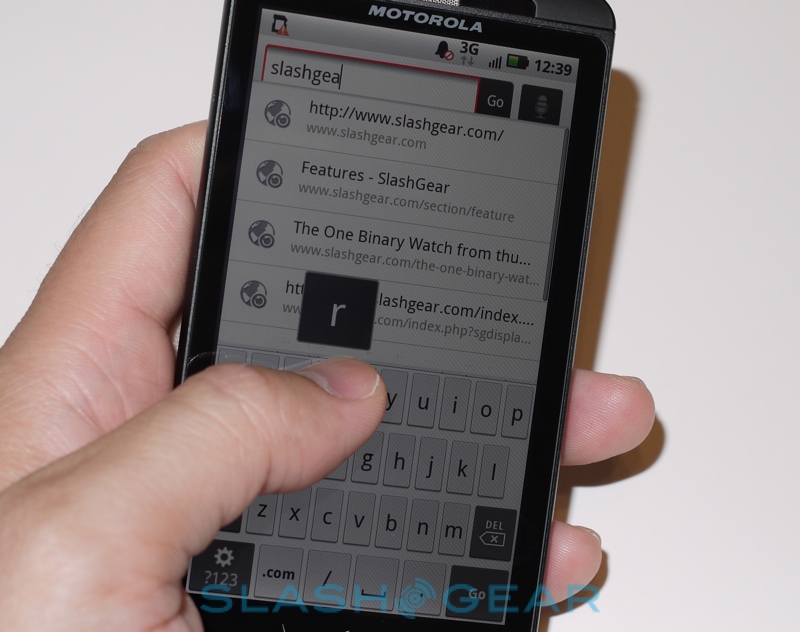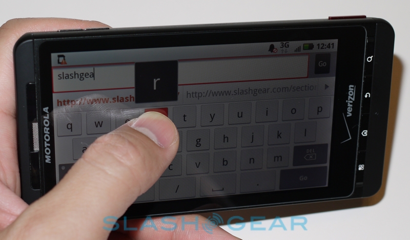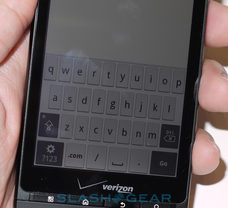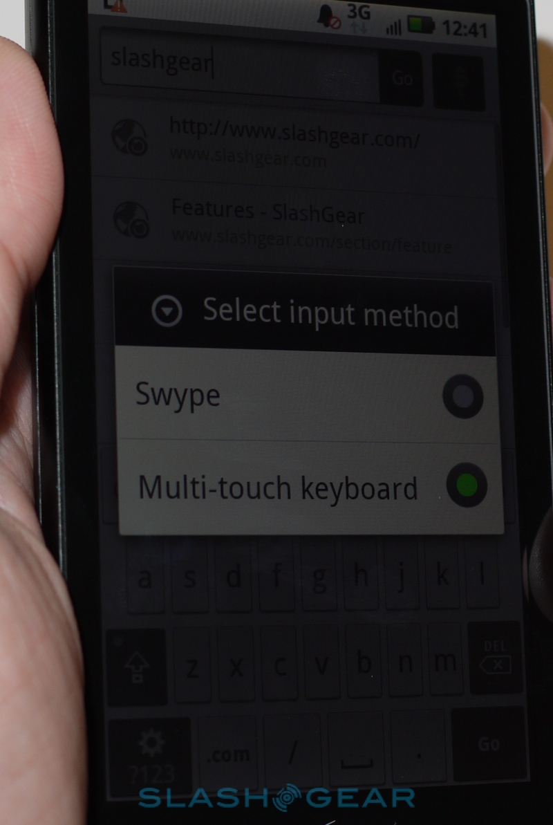 Motorola obviously achieved their 9.9mm thickness on the DROID X by dumping the DROID's hardware keyboard and instead settling on on-screen 'boards. Happily they've not limited themselves to the regulation Android 2.1 layouts but thrown in not only their own keyboards but the speedy Swype 'board, which allows you to type by dragging a finger between letters rather than pecking at them. Having used super-sized devices like the HTC EVO 4G (4.3-inches) and the HTC HD2 (4.1-inches) before, we're well aware of how straightforward on-screen typing can be when you've got a considerable amount of finger-room to play with, and the DROID X doesn't disappoint here either. Typing is accurate and you can comfortably use both thumbs with the DROID X in portrait orientation; Motorola has also added multitouch support into their keyboards, which allows for even faster typing if your fingers can keep up.