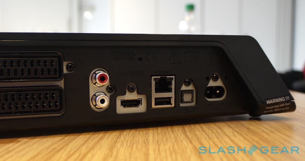 The HDS-600RS does a lot, and there's plenty of box to accommodate all that too. Measuring in at a hefty 386 x 280 x 58 mm, it follows the usual trapezoidal Slingbox style with red highlights. Up front is a 16-character LCD display and a row of nine touch-sensitive buttons, along with a USB 2.0 port and Smart Card reader. On the back, meanwhile, there's HDMI, two SCARTs, S/PDIF digital audio, RCA audio, another USB port, 10/100 ethernet, twin RF inputs and the power port.