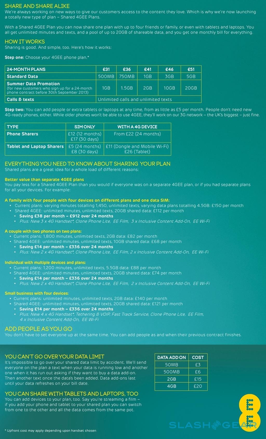 EE's shared plans, meanwhile, will support up to five devices, with unlimited calls/texts for phones and up to 20GB of data. Adding a phone costs an extra £12 per month on a 12-month contract; adding a tablet or mobile broadband device will cost £5 more. A data limit alert is sent out at 80-percent and 100-percent of the allowance being used up, after which point internet access is denied until a top-up data bundle is purchased. More details – and pricing – in the gallery below.