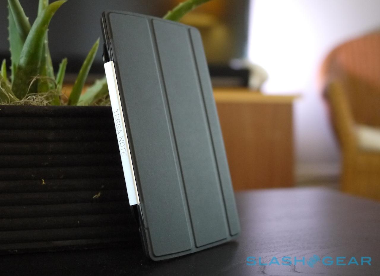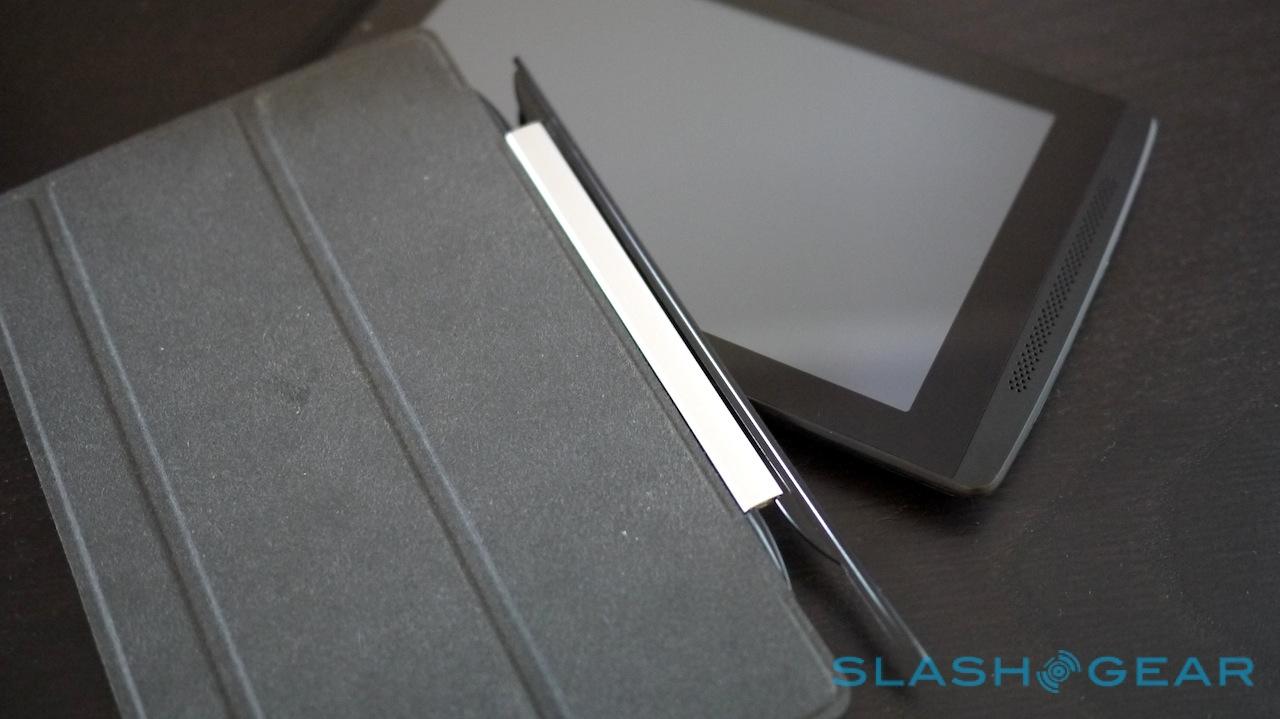 Ports include a 3.5mm headphones jack, a micro HDMI output, and a microUSB with Host support, all clustered closely along the top edge. A long groove running down the left side accepts the optional Slide Cover, which much like the iPad mini's folding cover can be twisted into a stand to prop the Tegra Note 7 up on your desk. It also powers on/off the tablet when you open it, though the hinge feels on the cheap side.