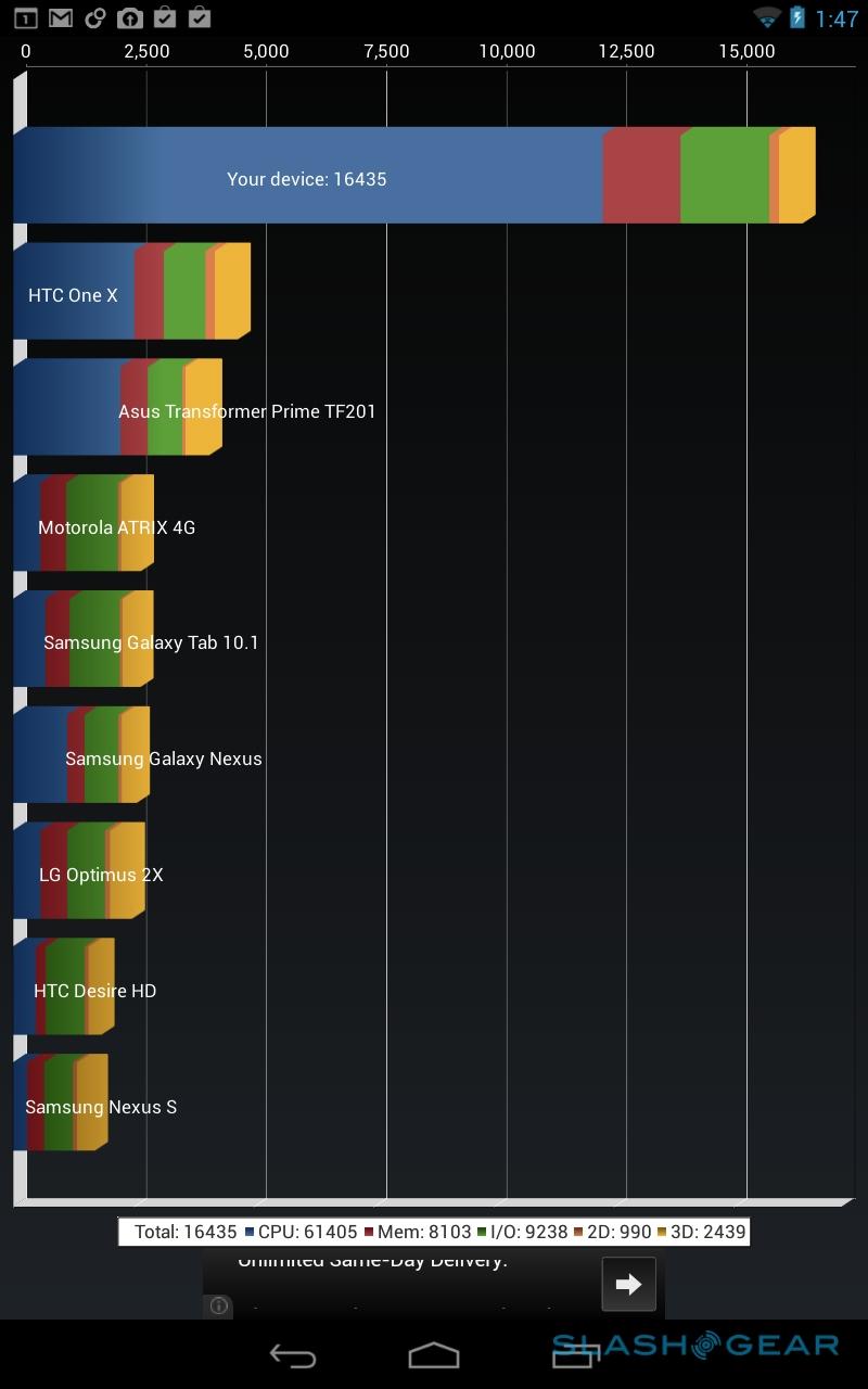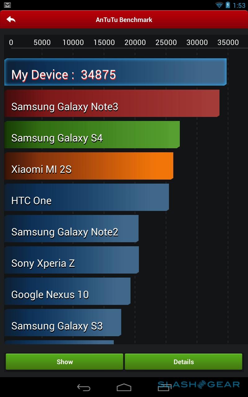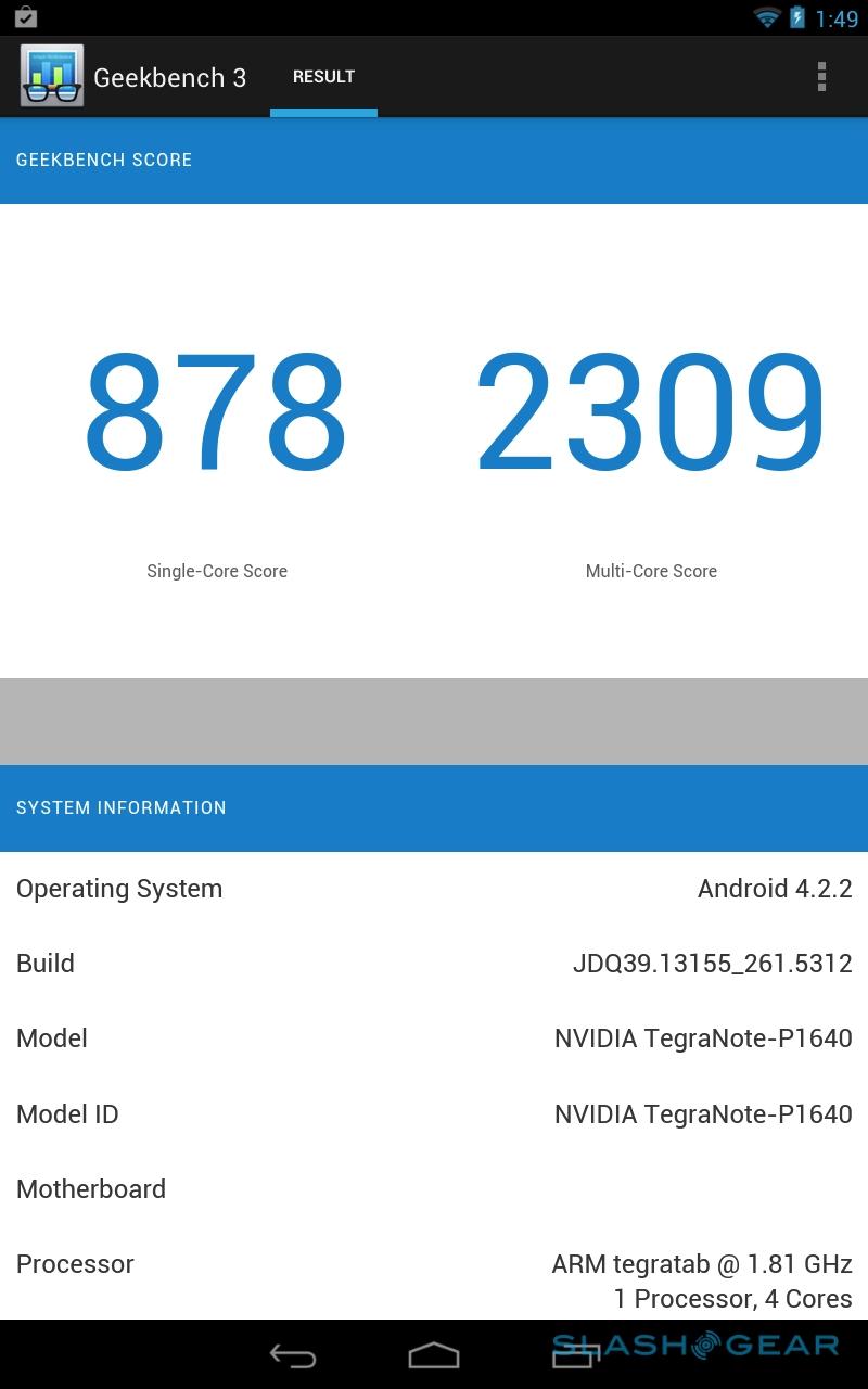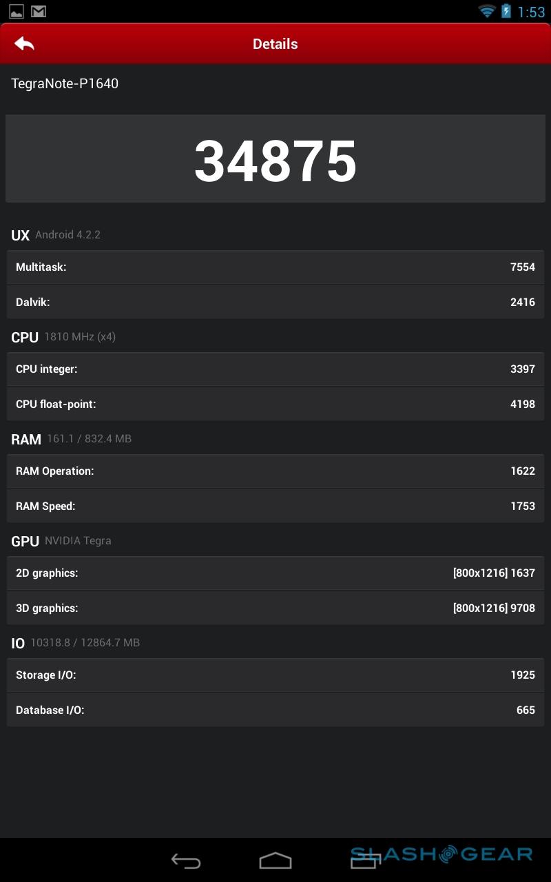 Benchmarks are only a small part of the performance story, but the Tegra Note 7 puts in a solid showing overall. It scores 34,875 in AnTuTu and 16,435 in Quadrant, along with 878 in the single-core Geekbench 3 test, and 2,309 in the multi-core test. That generally puts it just behind SHIELD, but day to day we noticed no slow-down or sluggishness in apps, browsing, or multitasking.