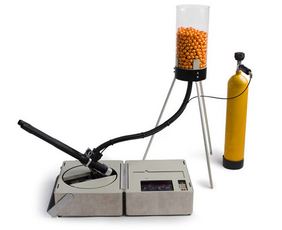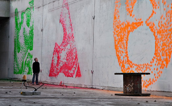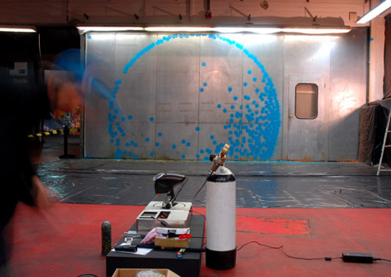 The printer was constructed from a converted paintball system, hooked up to an industrial PC running custom software. Using the touchscreen, images in SVG format can be loaded from a USB drive and overlaid onto a digital photo of the blank wall; that allows the artists to frame the painting exactly. A laser is then used to indicate on the wall exactly where the paintballs will be fired – useful if you discover you're currently standing where some high-speed Dulux will soon be approaching – before 5-10cm dots are created by the 200km/h colored balls.