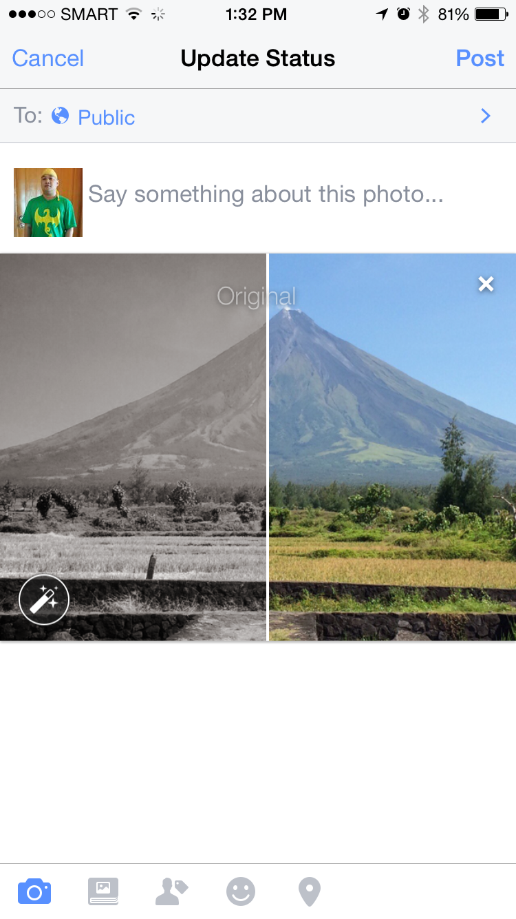 Some users on the iOS Facebook app might be greeted by some new user interface after uploading a new photo to share. They will, at first, see a vertical line sliding across the photo, hinting that you can slide your finger across the photo to see something. That something is the photo filters you can apply. Swiping again and again cycles you through the available filters. You can even stop half way to see a side by side comparison. At the bottom left corner, you will also see some icons, like a smiley, text, or crop icon which brings you directly to those functions. Alternatively, you can also tap on the wand icon when it appears in order to see all of those options at once.
