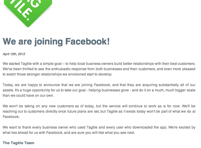 The cash Facebook has on hand isn't nearly ready to run out, this evidenced by the purchase this week of TagTile, a startup dedicated to making mobile payments as easy as possible. This company's purchase comes amid Facebook changing the mobile landscape by picking up Instagram for a whopping 1 billion dollars. Neither Facebook nor TagTile have yet announced the purchase price for the latter company as yet, but in that Facebook today launched their coupon program called Facebook Offers just this morning, we're guessing it wasn't a cheap pick-up (if TagTile was smart, that is.)