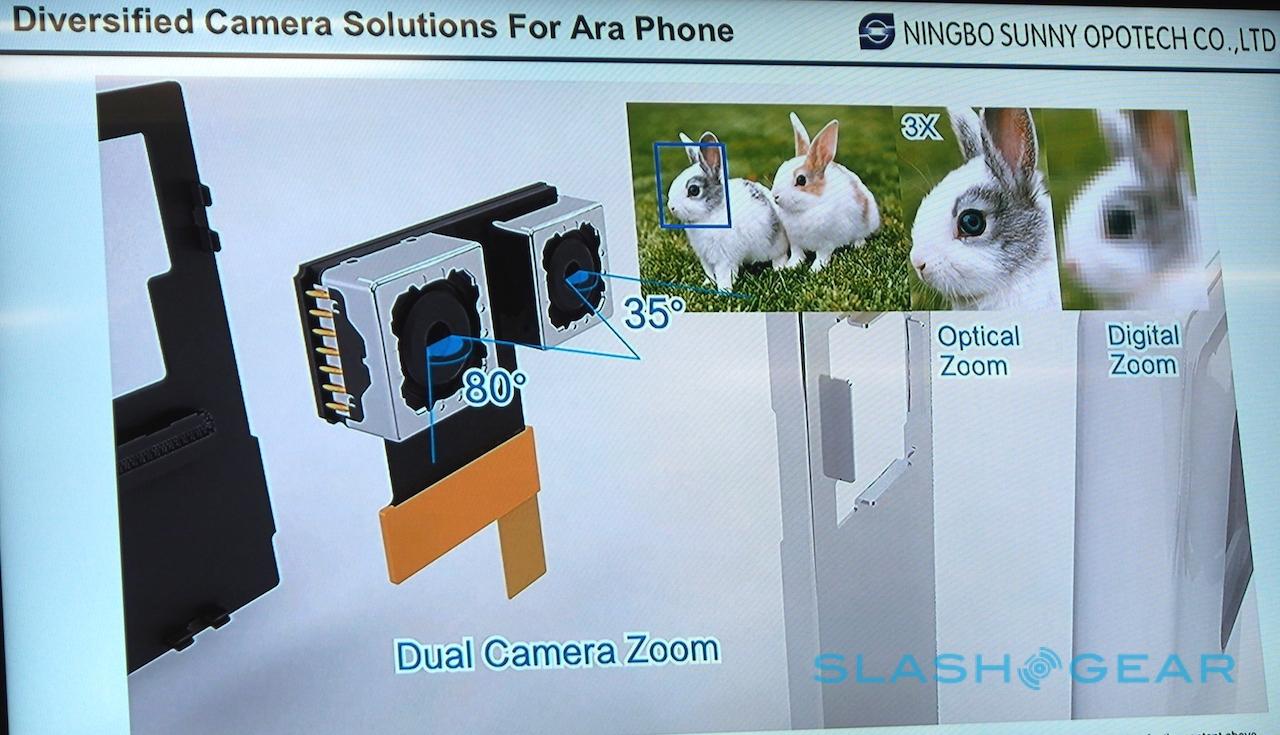 That's what Ningbo Sunny Opotech is looking at, a range of swappable cameras that – similar to how a DSLR can be outfitted with task-specific lenses – would each give an Ara phone a different optical ability.