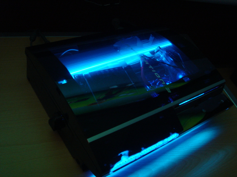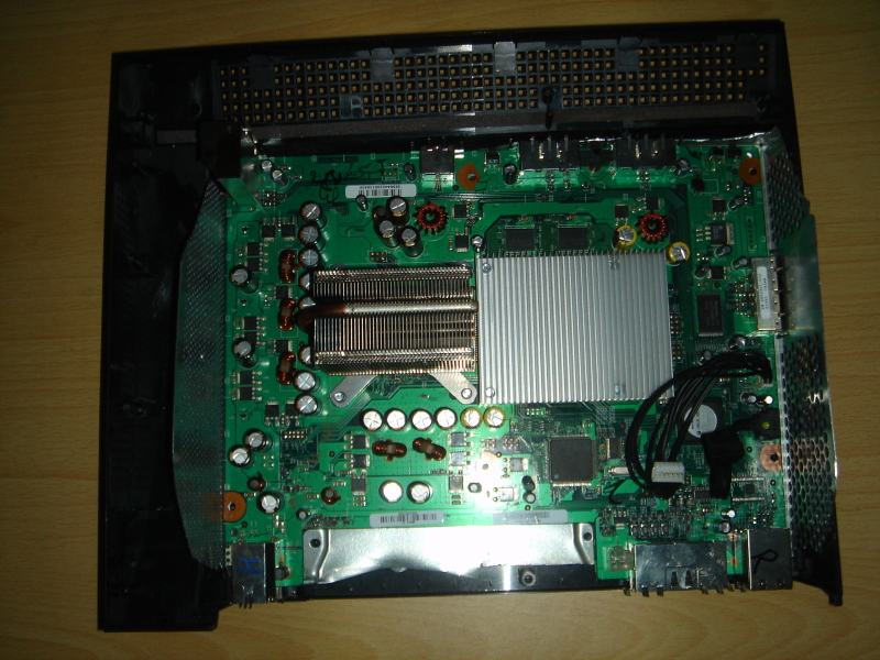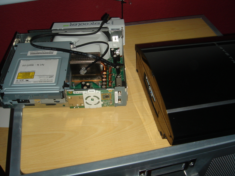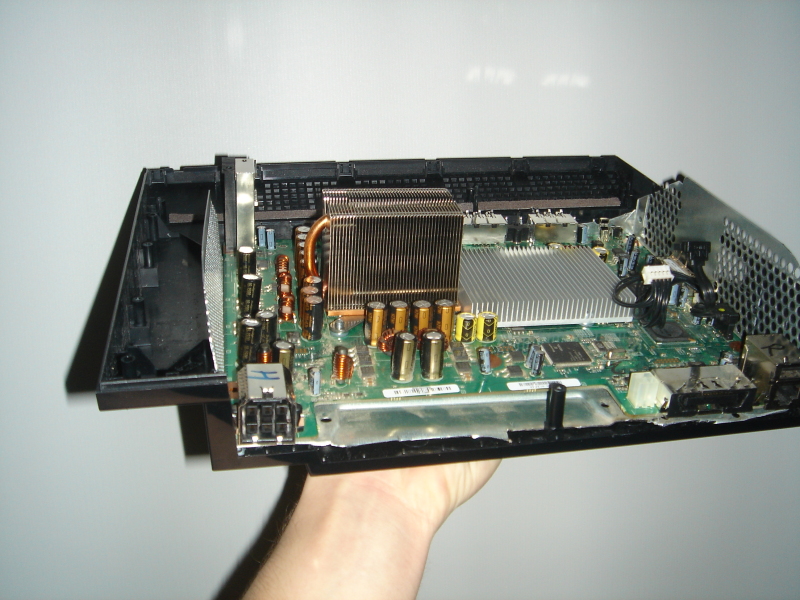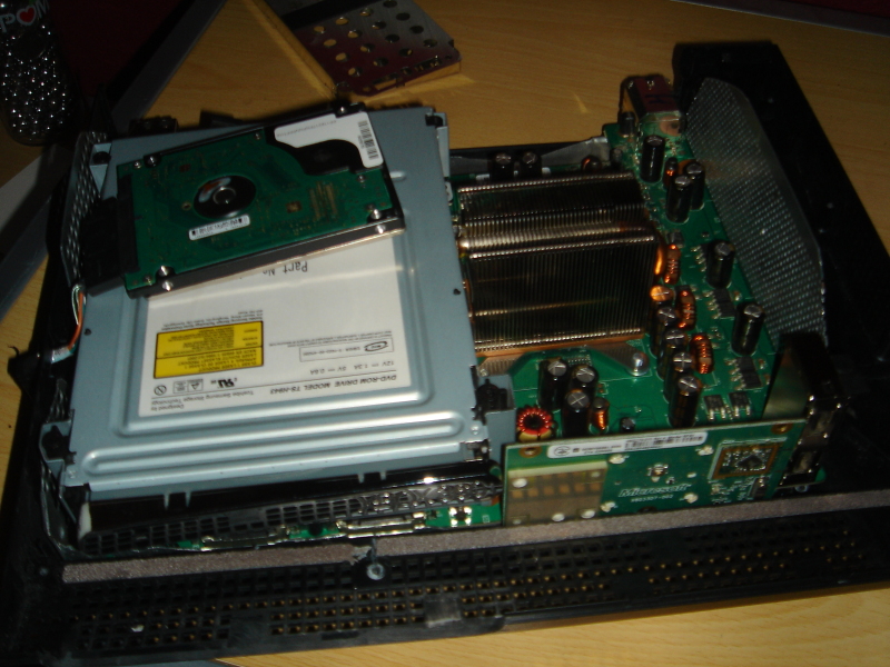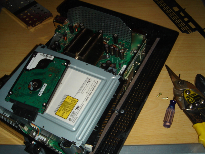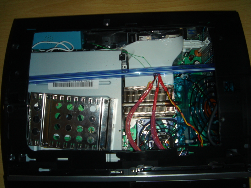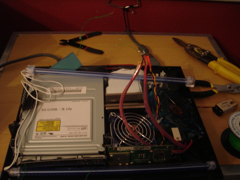 The metal casing around the main board was cut pretty horribly rather than just removed altogether. Also the hard drive is just placed loosely on top of the DVD drive, which does not look good to me. To top off this beast there seems to be no way of actually holding the internal components in place. All of the loose wires shooting out everywhere will not hold out when fans and hard drive rock around inside. Is it me or is something being powered by a 9V battery?