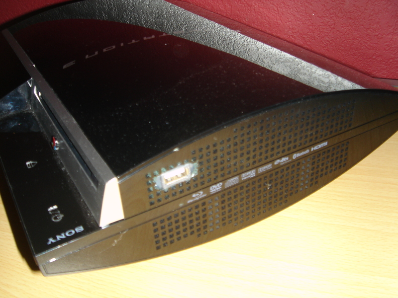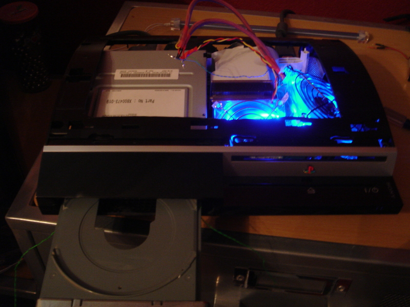 Now I have done far more than my fair share of chase modifications, but this is one of the ugliest, near failed attempts that I have ever seen. The hole in the front was made to allow access to the DVD drive, which could not be made to fit the now useless front-loading slot on the side. He went ahead added two fans to protect from overheating, which were soldered in what looks like house fire starting fashion.