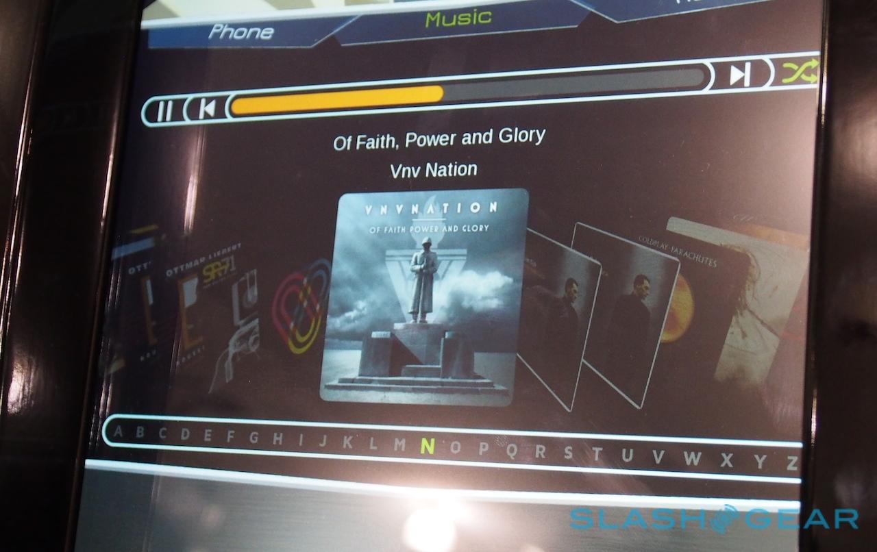 In the middle portion is the media carousel, showing cover art previews that can be side-swiped between. Buttons above switch between the FM radio and the phone dialer.