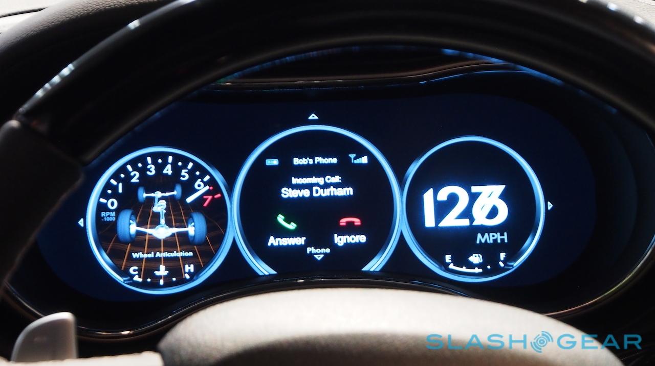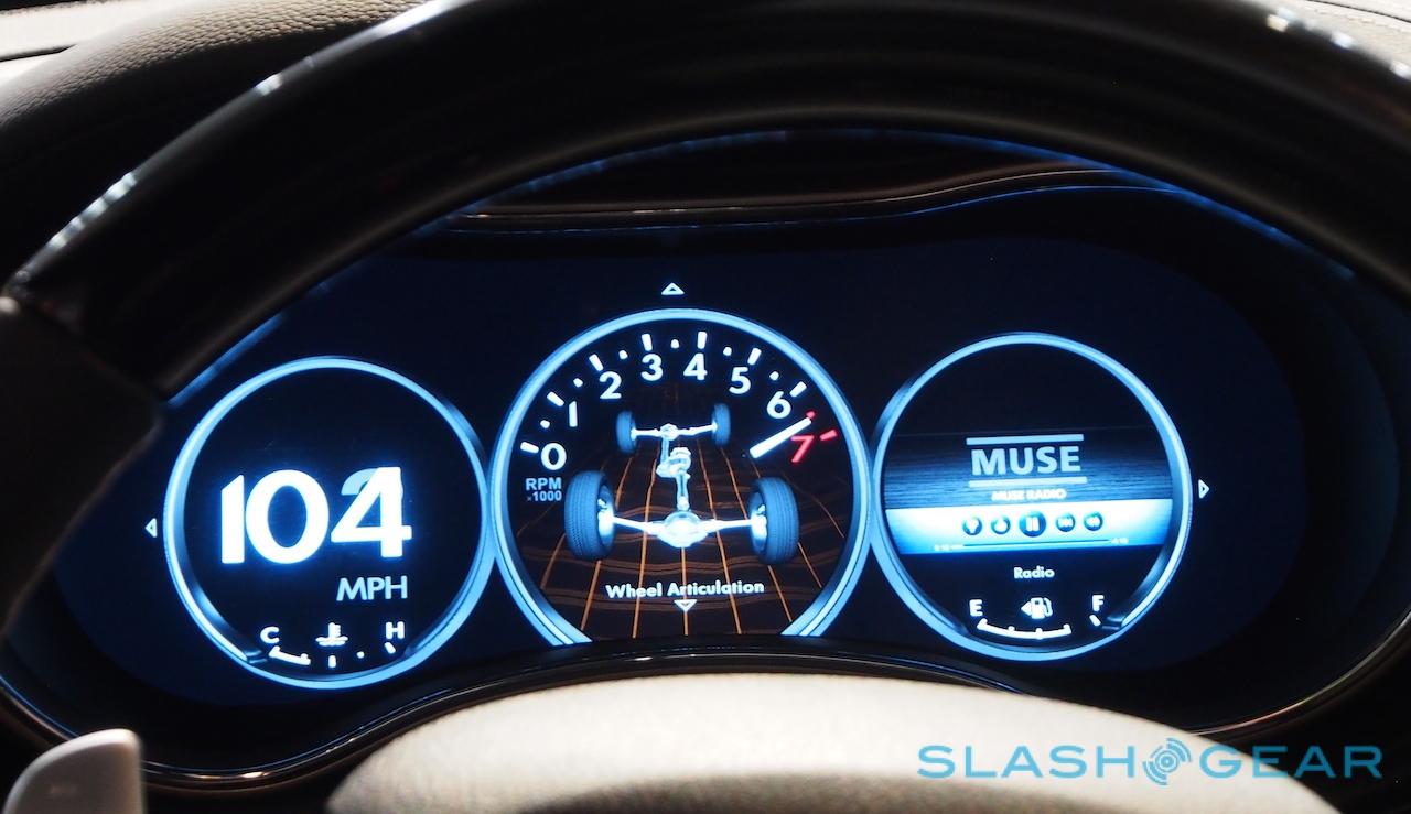 The high-resolution driver's display fits three circular windows that can mimic analog dials or give richer information. They're cycled between using a jog-dial on the wheel, and can show details like the immediate portion of the navigation mapping, caller ID for an incoming call, or live information on the current suspension settings.