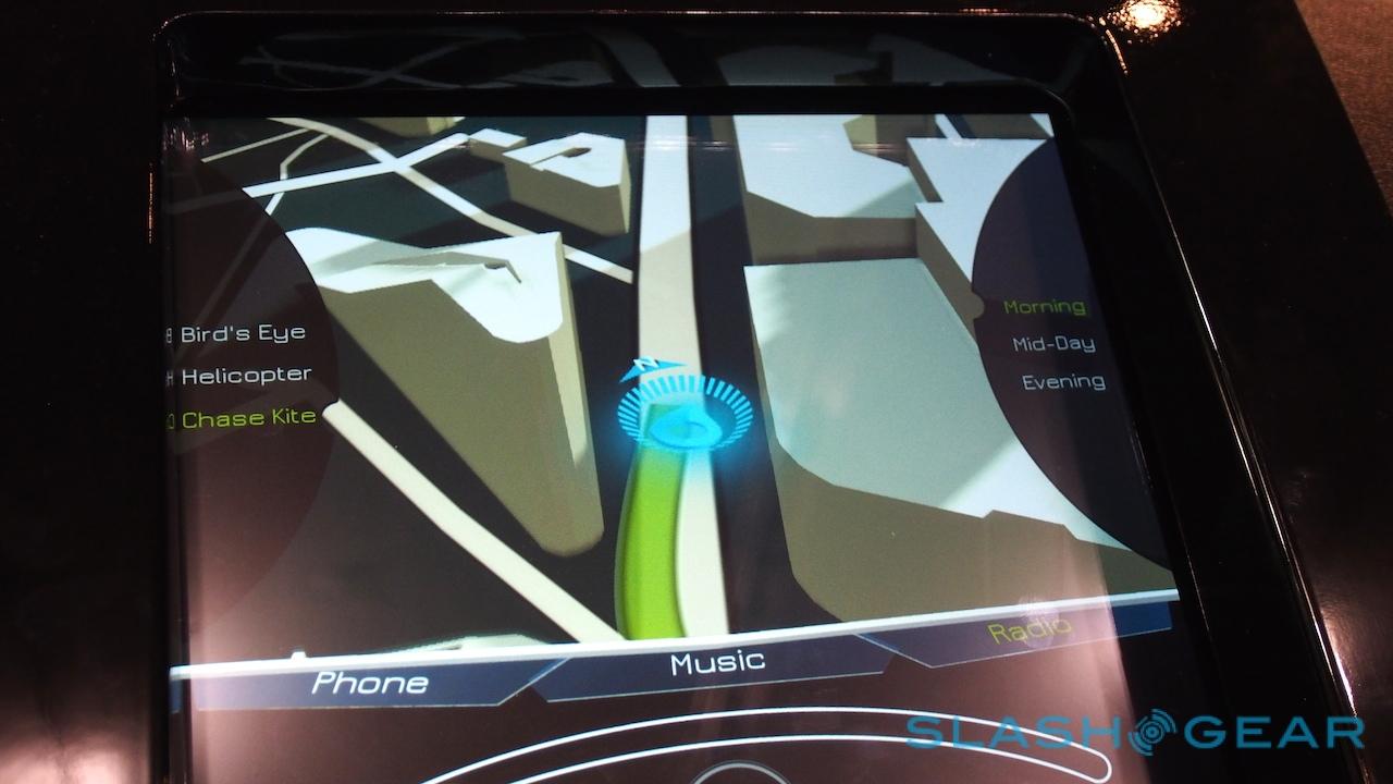 The capacitive touchscreen is split into navigation in the wider top half, while media and environmental controls are underneath. Different map views can be cycled between using on-screen buttons, ranging from a traditional overhead perspective through to a "kite" chaser view that whips through the translucent 3D buildings that punctuate the route.