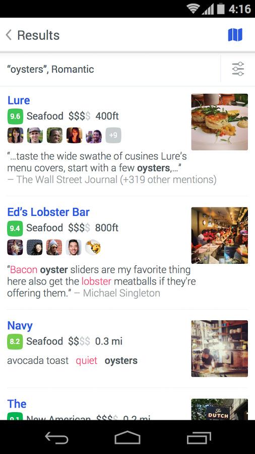 From there it's a combination of location and various categories like "breakfast" and "nightlife"; each of the suggestions in each category are shaped by the "tastes" that have been set initially. Individual listings will have keywords to give an impression of what they're like – like reviews, but a whole lot terser – and those left by Foursquare friends will be shown first.