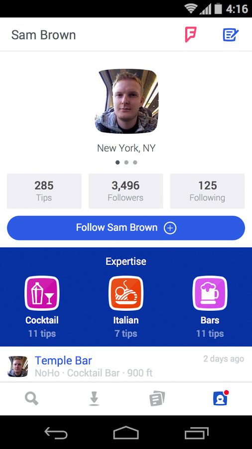 Reviews the user leaves, and their friends' feedback, will all shape future recommendations, Foursquare says. There's also the possibility of following "experts" like TimeOut for their suggestions.