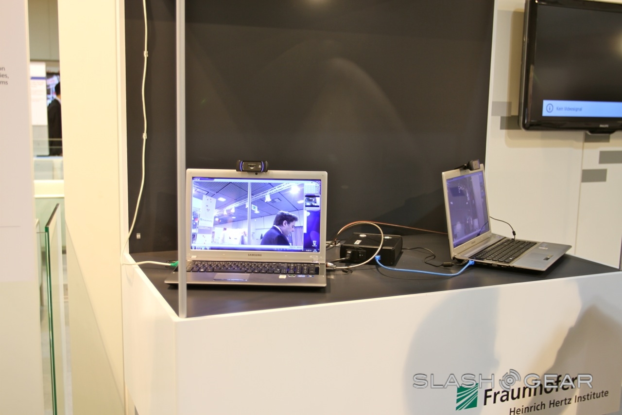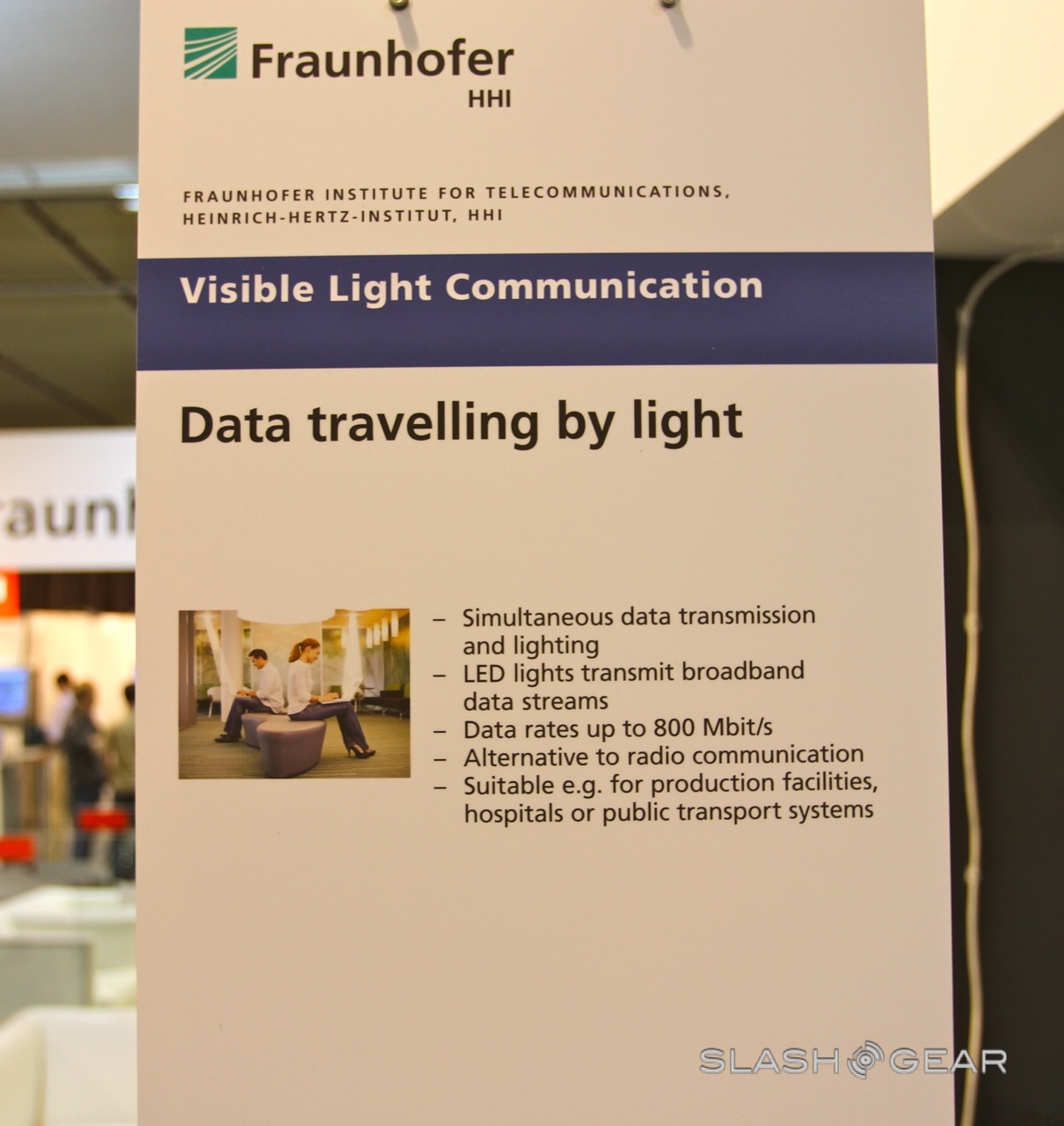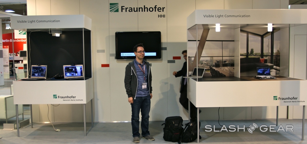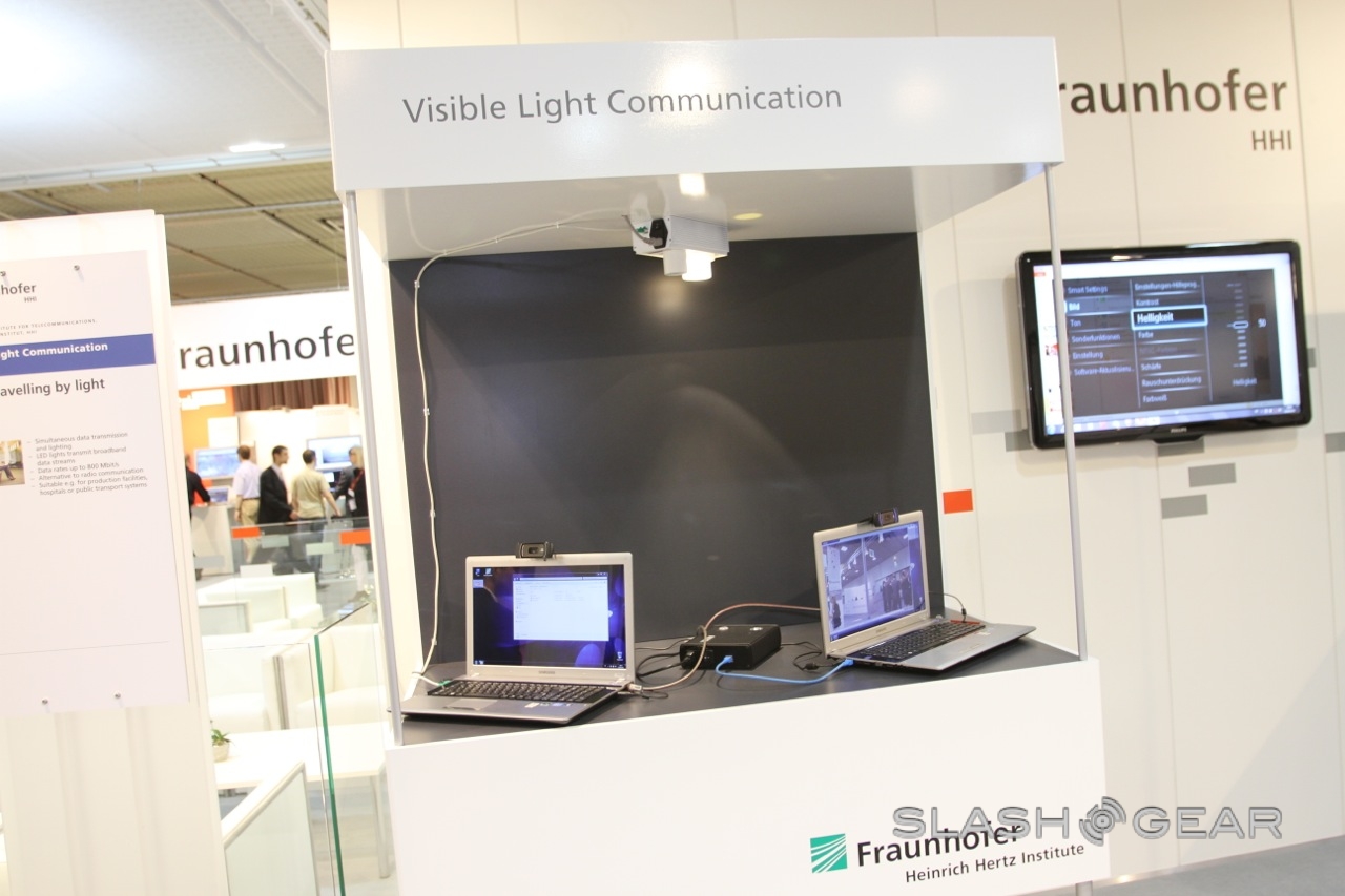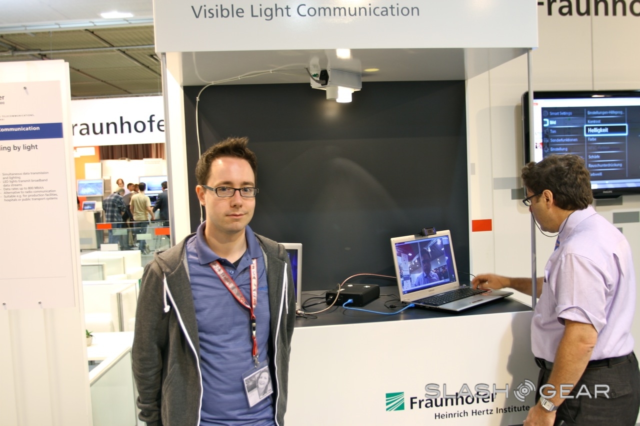 The Fraunhofer Institute's LED-based light networking technology left us mighty impressed on paper back in August, so we jumped at the chance to test the Visible Light Communication system here at IFA 2011. Promising up to 800 Mbit/s data rates from rapidly flickering white LEDs, without any risk to hospital equipment, airline hardware or sensitive manufacturing tech, Fraunhofer's demo ran at a more mundane 10 Mbit/s but was still enough to stream high-res video streams between two notebooks. Check out the full video and more details after the cut.