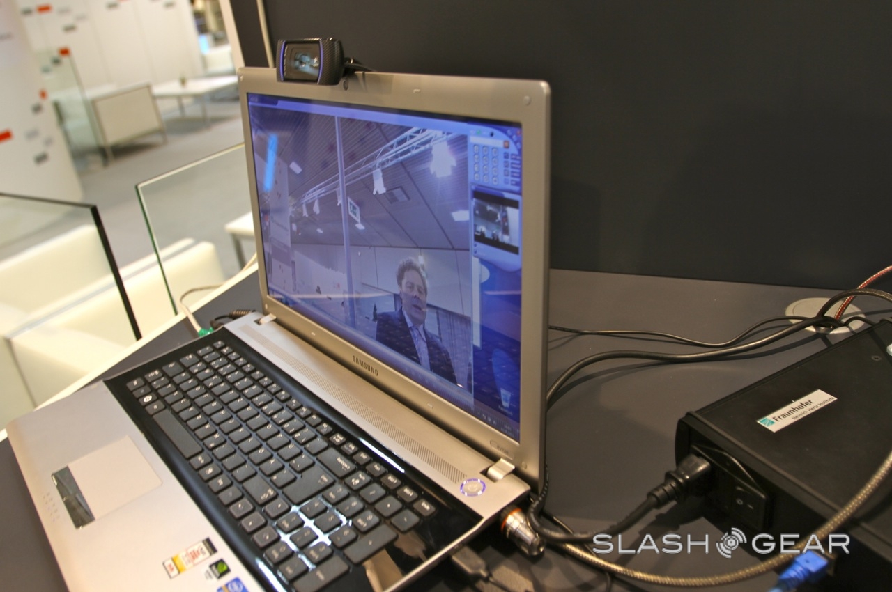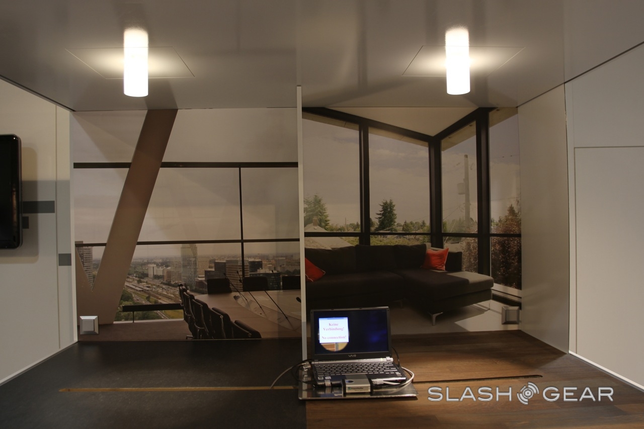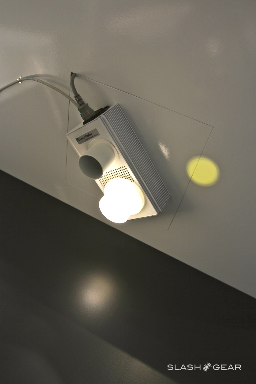 In the video conferencing demo, one laptop was hooked up to a custom light fitting via ethernet cable, and another was connected to a receiver box. The light used LED to transfer data to the receiver, and then the receiver beamed back its own data using infrared for bi-directional communication. Put your hand in-between the sensors and the conversation froze; remove it and it automatically resumed.