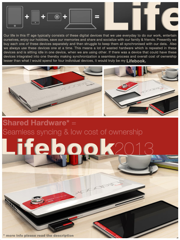 A concept Fujitsu notebook could pull together your notebook, tablet, smartphone and digital camera, according to one designer's convergence ambitions, with the Fujitsu LIFEBOOK2013 docking each mobile gadget into a core laptop chassis. Created by Prashant Kumar Chandra for Fujitsu's "A Life With Future Computing" competition, the concept consists of a roughly 17-inch notebook that uses a detachable touchscreen tablet as its keyboard; a smartphone docks into a slot at the front, lending its WWAN connection, while a digital camera slots into a cutaway on the lid.