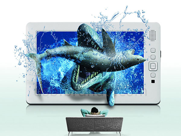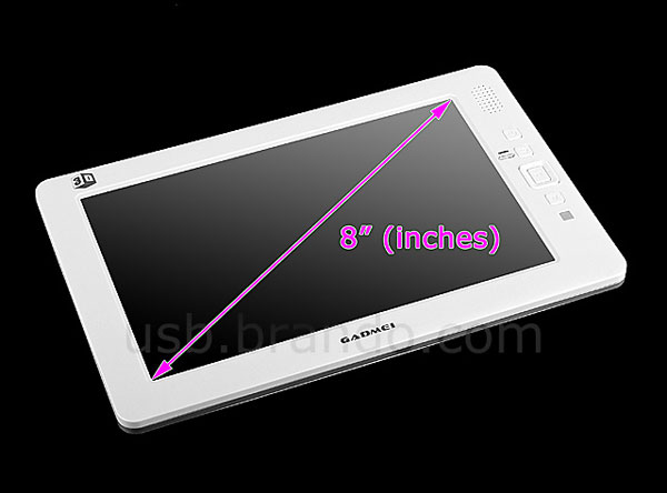 It has a big 8-inch screen and a resolution of 1280 x 768 and can show 3D content without needing any glasses. The device supports multiple video and audio formats with support for 3D formats. It has a button to turn the 3D effects on or off. The device has full 1080p video out support and supports connecting of flash drives, USB HDDs, and SD cards for playback.