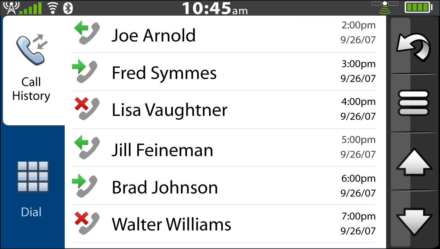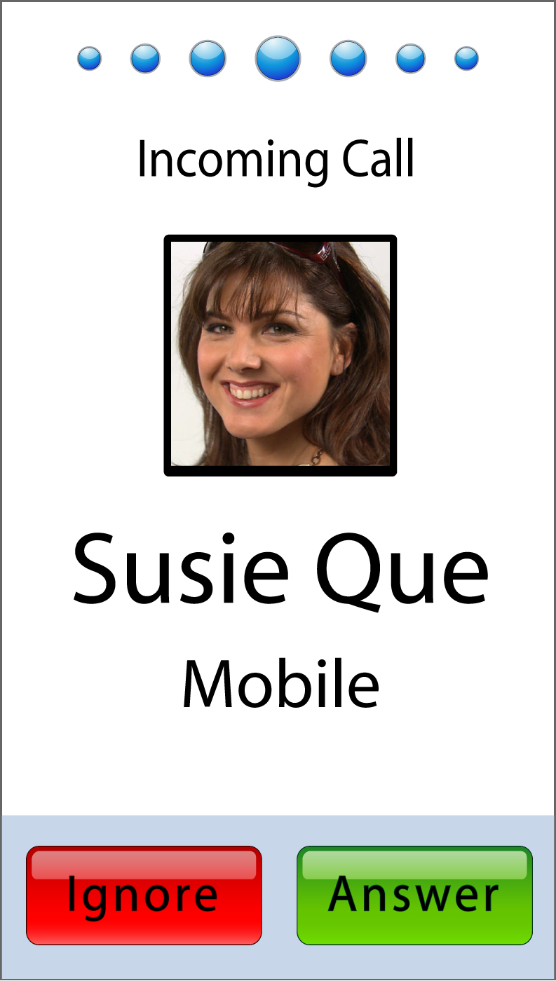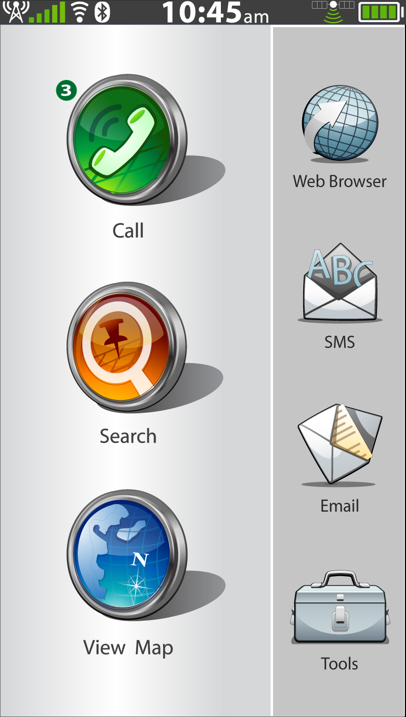We now can see what the home screen looks like. It will feature three large buttons on the left side taking two thirds of the screen itself. These buttons give users quick Call, Search and Map shortcuts. On the right hand side you conveniently have access to Web Browser, SMS messaging, Email and Tools. When receiving an incoming call users will be greeted by a screen that is all too familiar. The callers name is displayed just above a picture of the caller and there are red and green buttons at the bottom for, you guessed it, answer and ignore.