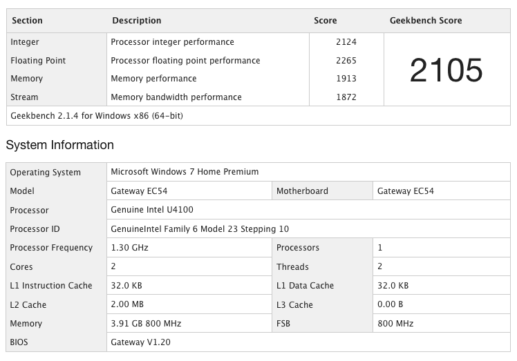 Inside, Intel's CULV processors make an appearance, in this case the 1.3GHz Pentium SU4100, paired here with 4GB of DDR3 memory and a 320GB 5,400rpm hard-drive; it comes with Windows 7 Home Premium. While we're used to seeing the CULV chips show up in 11- to 13-inch ultraportables, it's a little unusual for them to crop up in a 15.6-inch machine which might more regularly have a mainstream CPU. As a result, the Geekbench benchmarking results aren't especially impressive: with an overall score of 2105 the EC54 lags slightly behind the 1.4GHz Acer Aspire Timeline 3810T we reviewed four months ago.