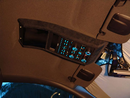 The dude took those controllers along with the factory faceplate for the center console and moved them to the roof. The finished product is pretty slick, even if you will have to look at the roof to adjust the radio or ventilation system. That missing section in the faceplate above the lit buttons for the car systems is where the LCD screen now under the iPad normally sits.
