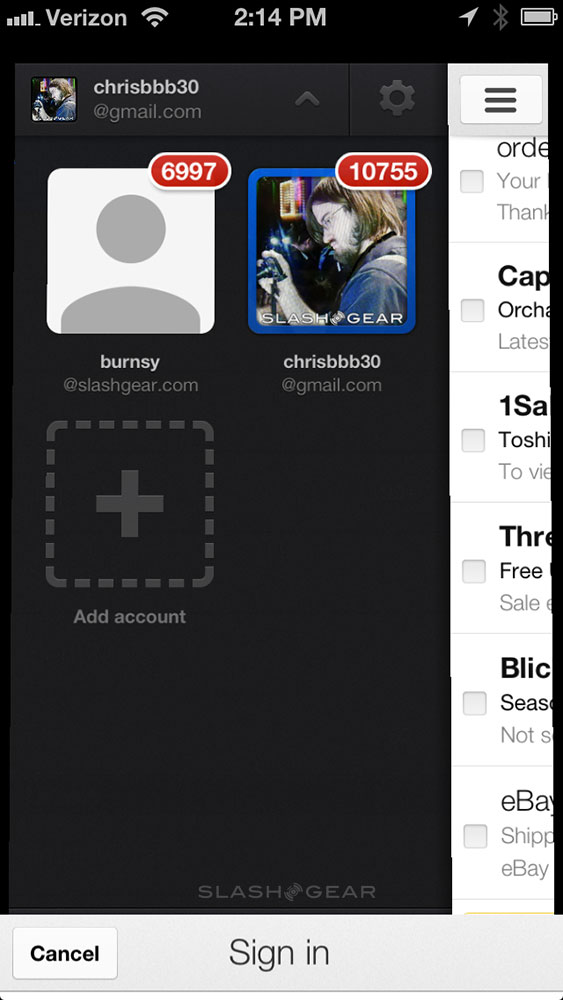 This new version of Gmail has, first and foremost, easy access to multiple accounts. Perhaps you've got an account for work, another for personal business, and another you use to keep in contact with your granny. You don't want those all mixed up, do you? Gmail 2.0 makes it perfectly simple to switch between them on the fly with a simple tug of the display – right up where your profile name is – check the new arrow and make your faces appear.