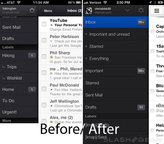 The 6 months since the team at Google announced they'd be creating a whole new Gmail experience for iOS have been spent not just adding usability features, but adding aesthetic cues and tweaks as well. You'll find that this version of Gmail is flatter and smoother than ever before, even going so far as to update the color scheme of the icon for the app – white now takes over the previously dominant red – or does it emphasize it?