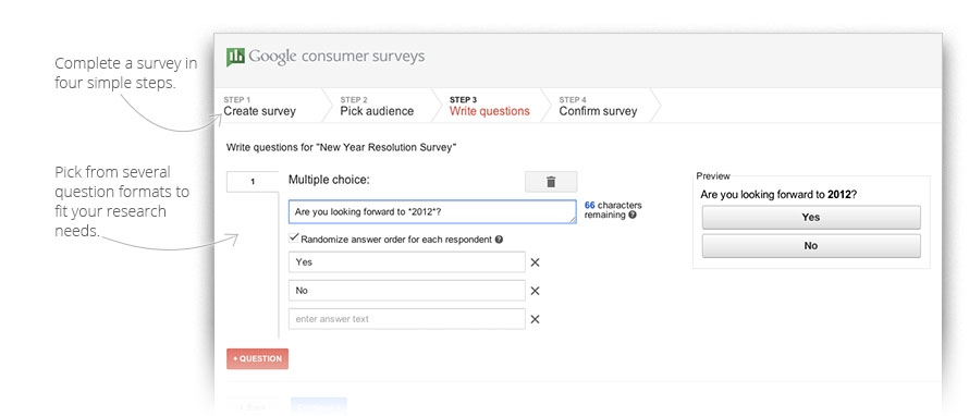 Google already knows plenty about you, but if you want to figure out more about your fellow users then the freshly launched Google Consumer Surveys tool could help. Taking on established questionnaire services like SurveyMonkey, Google's offering includes straightforward setup of multiple choice questions, point-scale rankings, and more, but also promises to pay websites that present surveys to their visitors.