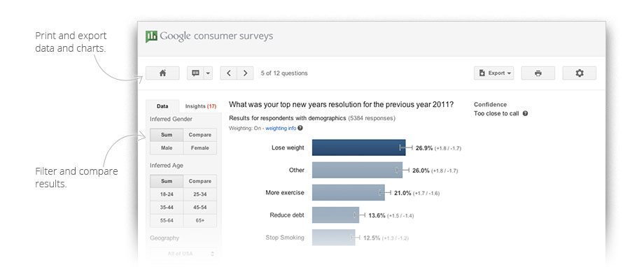 For the survey operator, there's automatic aggregation and analysis of the responses, all laid out in graphs and charts. Google also uses its IP address tracking and DoubleClick cookies to match up demographic data, too, though if you want demographic targeting of who sees your surveys then you'll have to pay more.