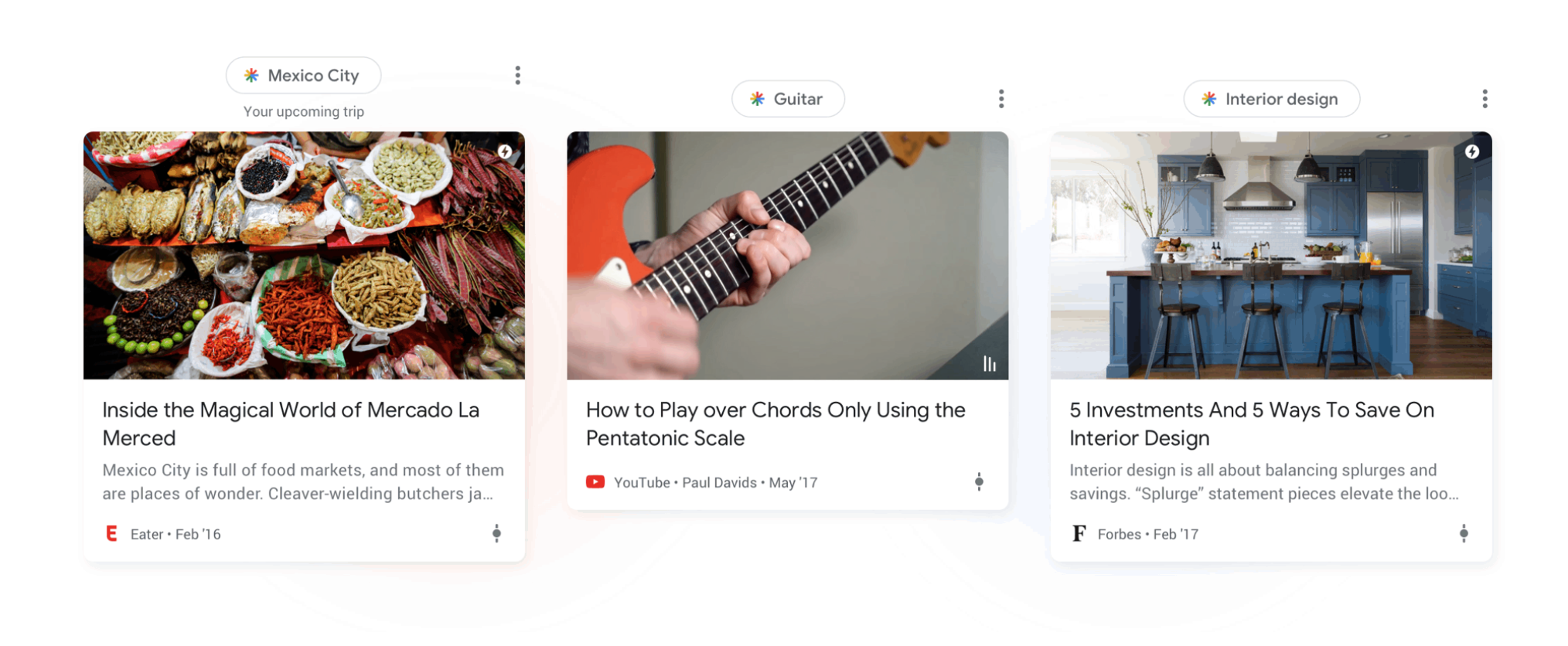 To make this a reality, Google Feed was changed to Google Discover. In this section in Google's app (and in some cases, on an Android's home page), are a set of topics. Each topic is chosen based on a variety of elements, unique to each person. Also in the mix: location information, time, and date.
