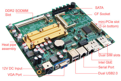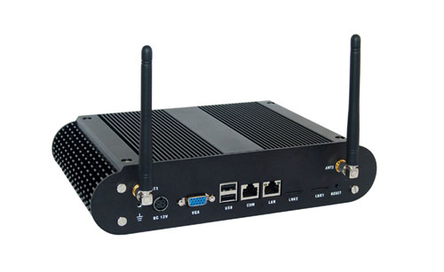Other features of the machine include a VGA port supporting up to 2048 x 1536 resolution, a serial port, SATA port, a gigabit Ethernet port, CF socket and dual SMA sockets for 3G antennas. The machine uses the Habey ICEFIN design to keep it running cool.