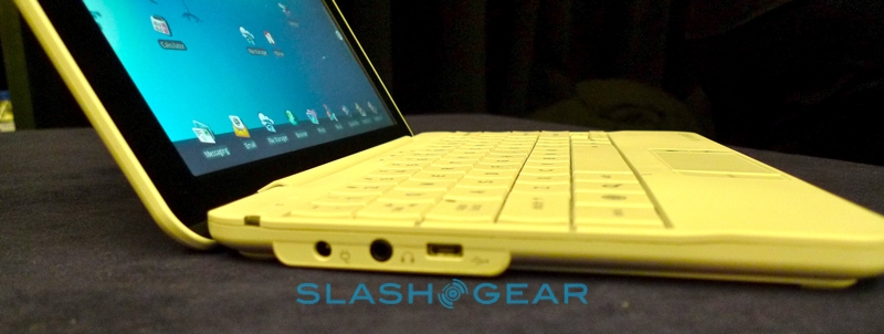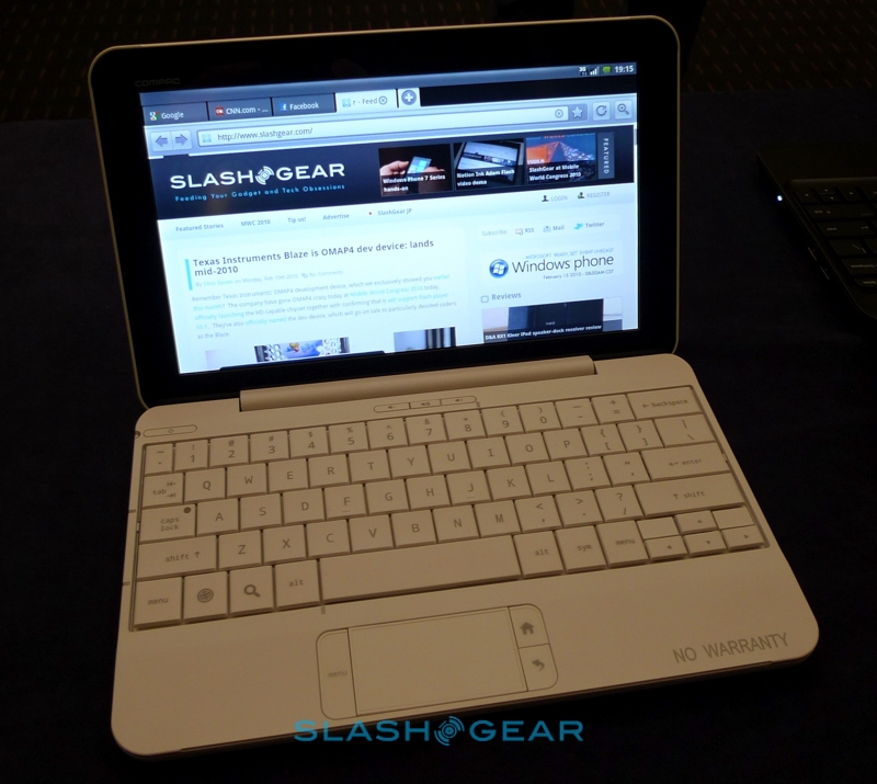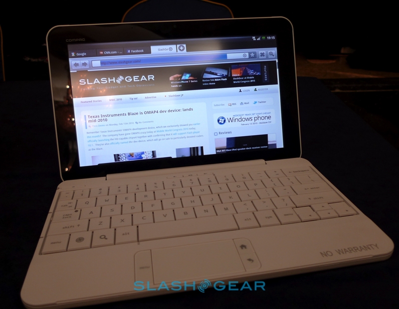First thing we headed for at MobileFocus 2010 today was HP's first smartbook, the Compaq Airlife 100. In the plastic it resembles little more than a particularly slim netbook, though of course there are some significant differences; the OS is Android 1.6 Cupcake, complete with a resistive touchscreen, and the keyboard has been reworked to suit Google's platform. Keeping the whole thing moving is Qualcomm's 1GHz Snapdragon processor.