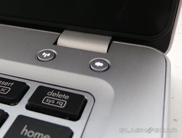 Also important if you want to keep your machine secure is the built-in HP Fingerprint Sensor which appears on the right side of your palm rest – make sure you're not eating too much cake before you try to get read. Up to the right above your keyboard you've got dedicated on/off switches for both wi-fi and sound (muting, basically), and up and to the left you've got your power button – heavy metal!