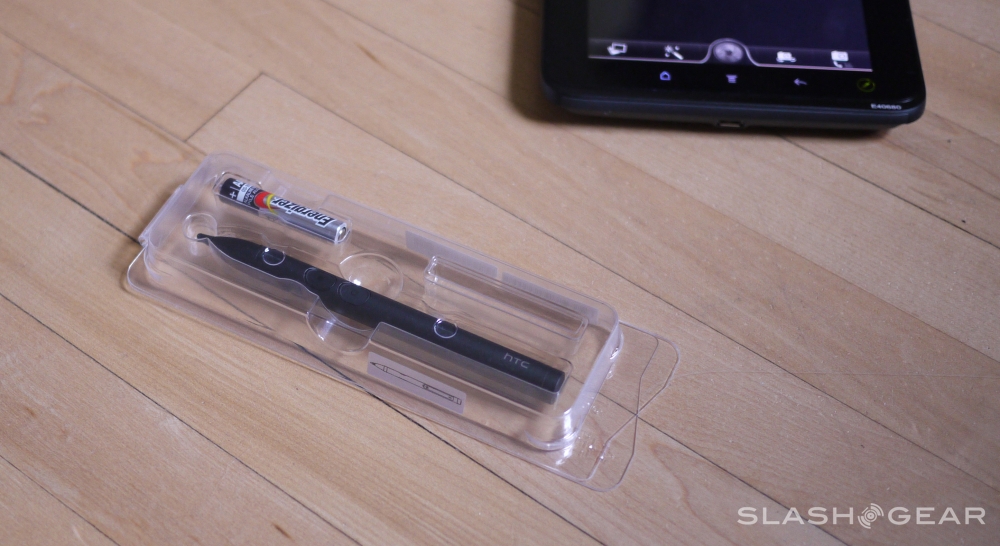 One problem with this device, and I'll explain how to fix it in a moment, is that the scribe pen does not attach to the tablet in any way. If you want to keep it with the device, you'll have to... I don't know... tape it to the back, right? No way. All you've got to do is head to the accessories bin and pick yourself up a case – HTC has several official models that'll work perfectly for you – you'll be wanting to keep that nice glass display safe anyway. Head back to our sister site Android Community's post entitled HTC EVO 3D and HTC EVO View 4G Accessories Rundown and see everything you can get.